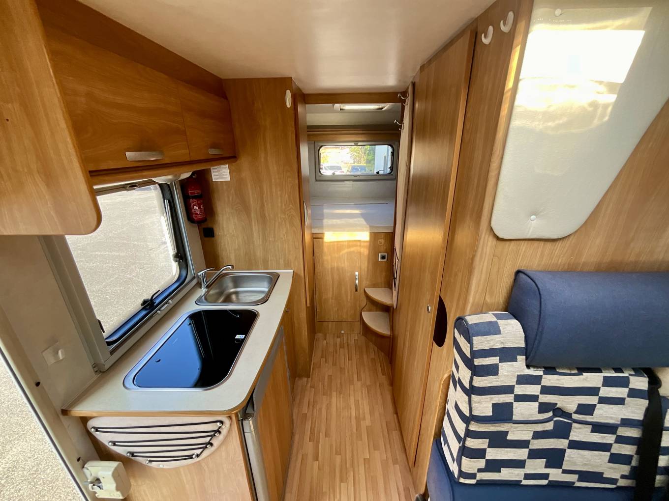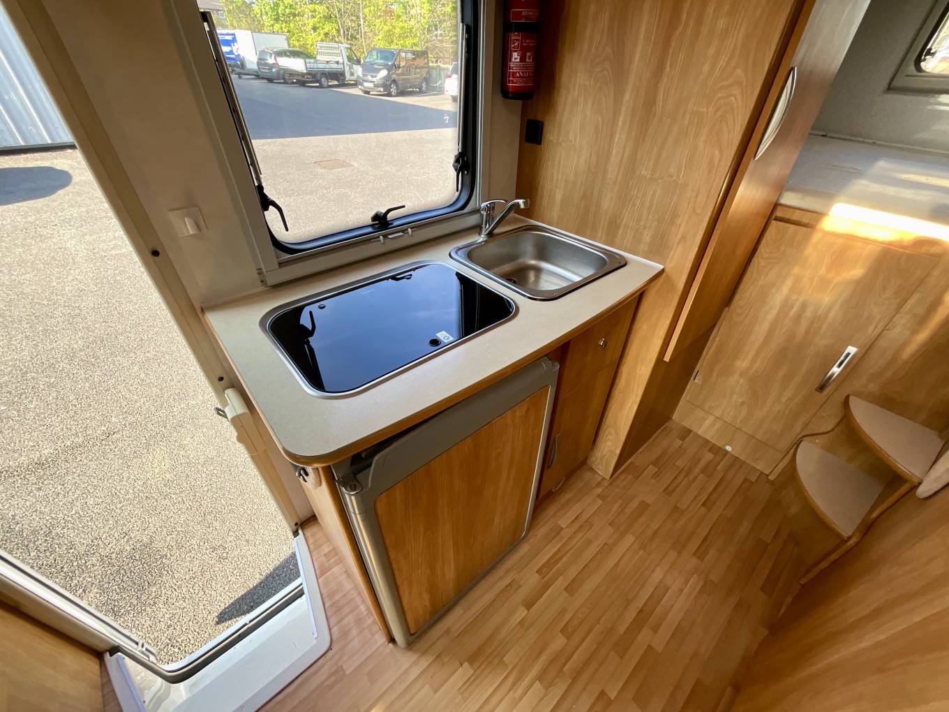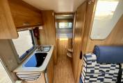 In the middle features the kitchen area with gas hobs, large three way Dometic fridge, sink with water pump. The water is heated using the Truma boiler holding 10 litres, and features blown air heating.