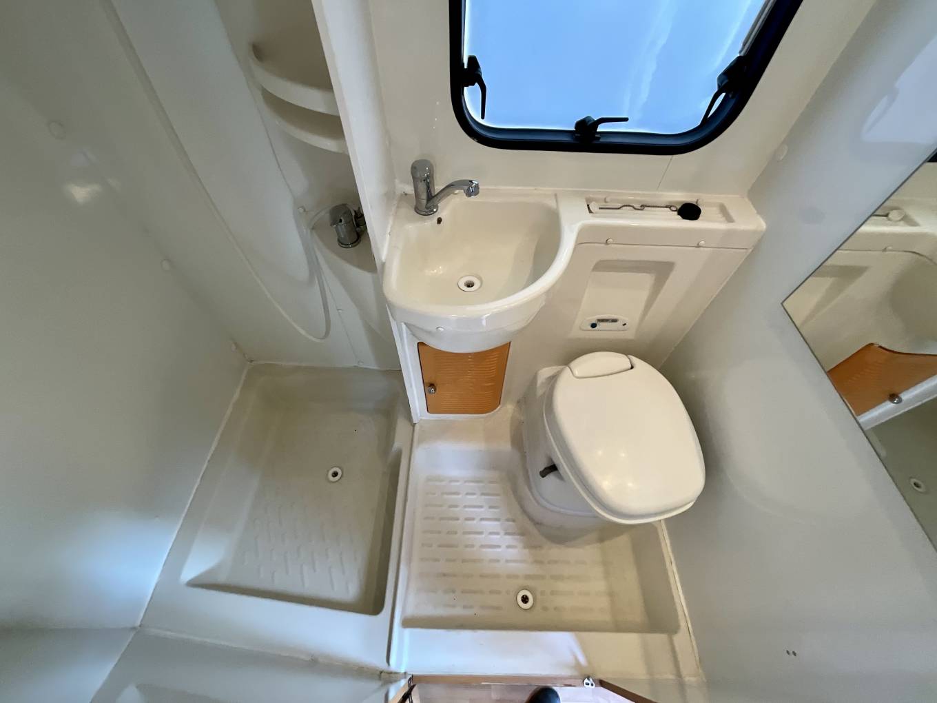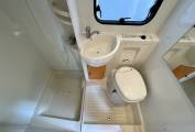 A spacious washroom sits opposite the kitchen, featuring Thetford toilet with cassette, shower, washbasin and vanity unit.