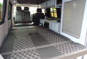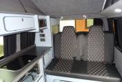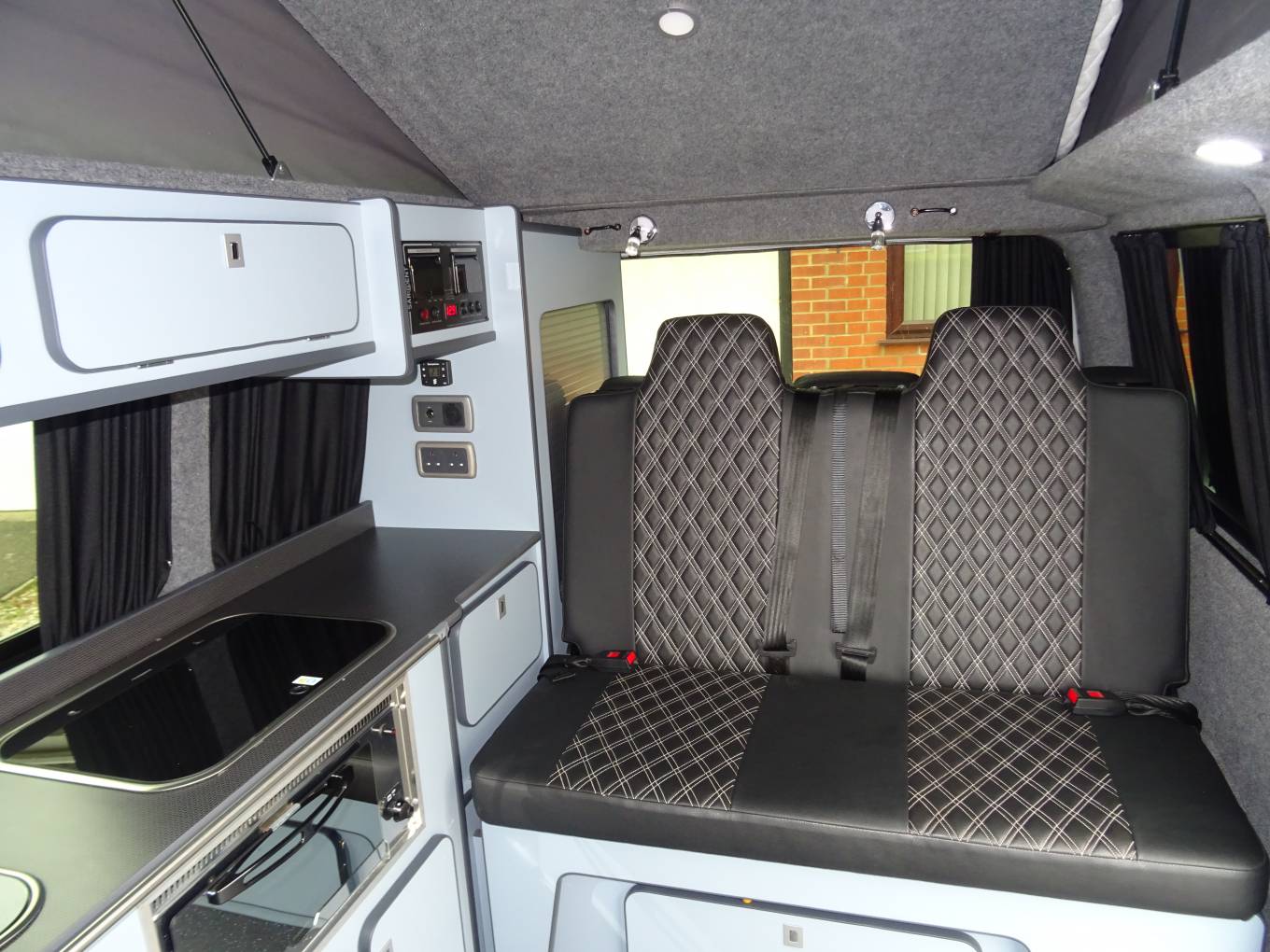 The front double seat swivels round making the central seating area very comfortable and a great socialising space. To the back, the rear rock and roll bed easily makes into a good size double bed with 2 belts and the pop top bed with gas risers sleeps 2 people comfortably.