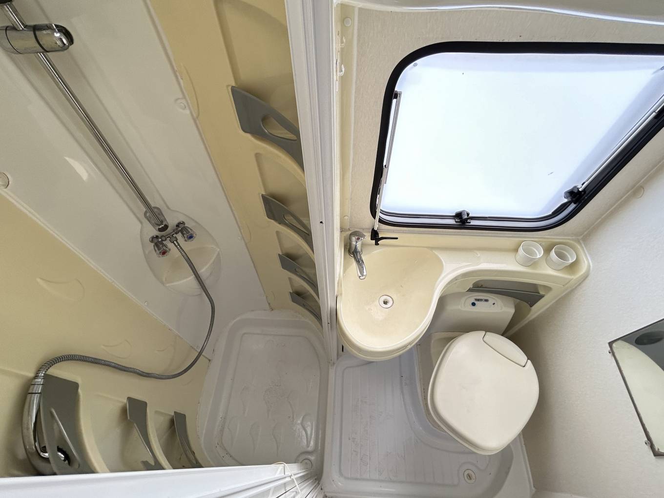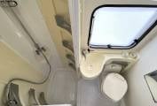 Towards the rear of the vehicle is the washroom. There is a separate shower with screen doors, a Thetford cassette toilet, a wash basin with a storage cupboard underneath, a mirror and a large window.