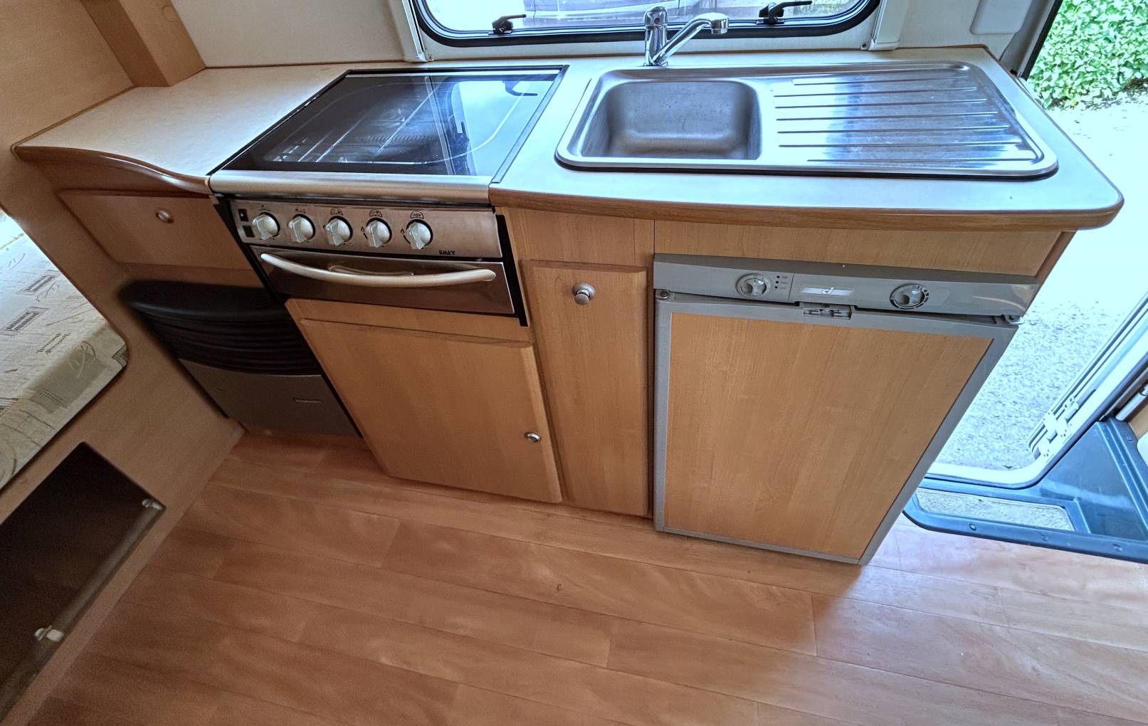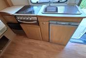 The kitchen is equipped with a 4 gas burner hob, a grill, a 3 way fridge with an ice box, a stainless steel sink with a mixer tap and plenty of cupboard space for your cookware and crockery.
