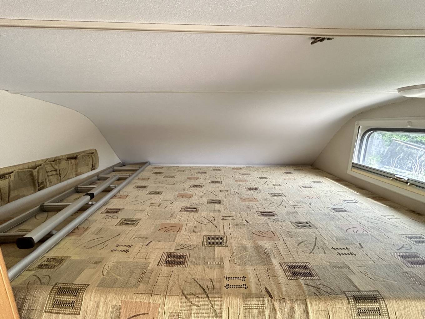 The layout inside comprises of rear bunk beds measuring 82 x 39 inches so if you have young children this is the perfect layout. The rear bunk folds up to create extra height in the garage which gives you a considerable amount of storage space to pack your belongings for your travels.