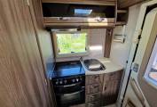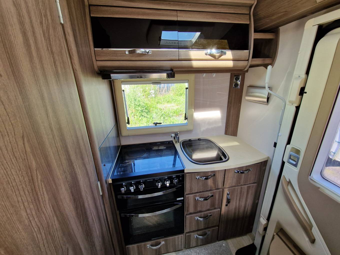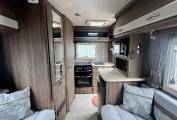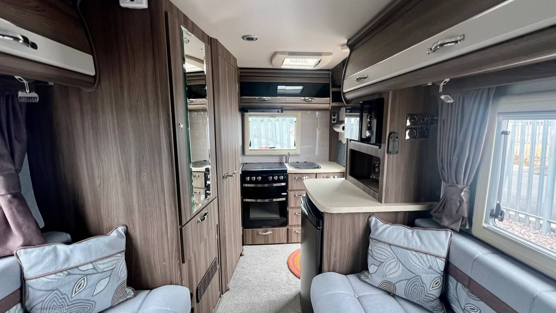 The rear kitchen area comes well appointed, with a full cooker featuring three gas rings, a mains hotplate and a separate oven and grill. Alongside that is a sink with glass cover and removable draining board. Then, forward of the habitation door, is the fridge (a compact, under-counter model), plus a microwave and a set of cut-glass wine glasses clipped into their own recess. There are additional flip-up and pull-out worktop sections here.