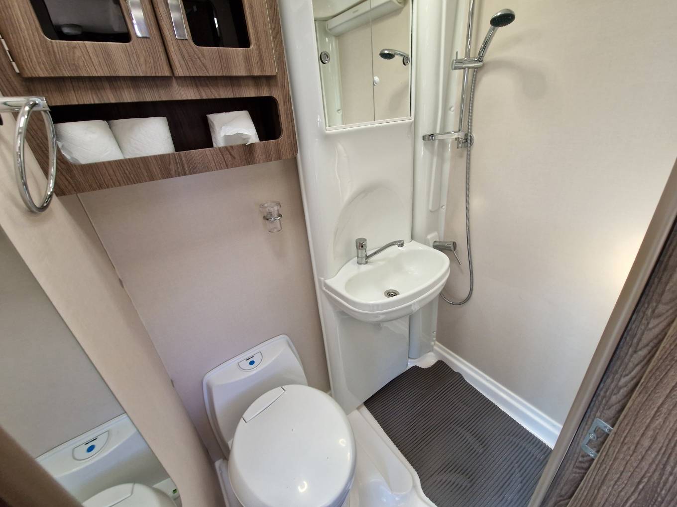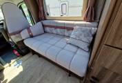 The corner bathroom has a shower and the wall onto which the white plastic basin is affixed swings through 90 degrees to create a showering space away from the cassette loo and without recourse to a curtain. Water tanks are underslung with capacities of 102 litres (fresh) and 71 litres (waste). It’s also worth noting that gas comes from a built-in 25-litre LPG tank.