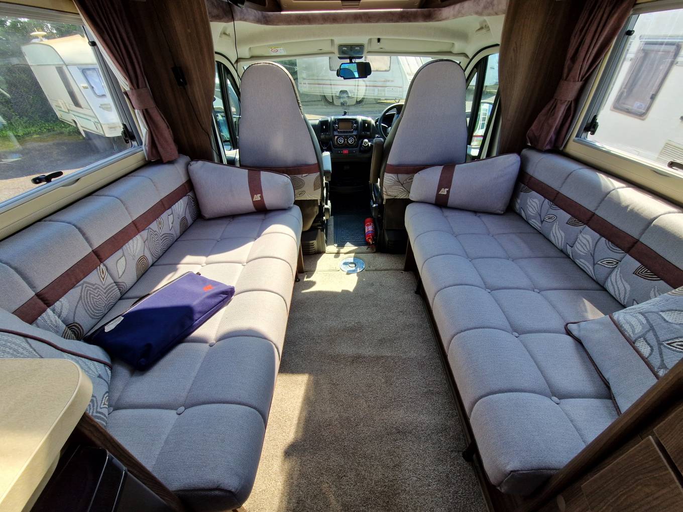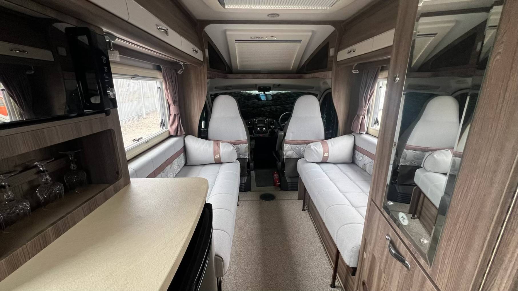 The lounge comes with a removable free-standing table and, with the cab seats swivelled, there could be room for eight people to sit and natter here. Armrests and scatter cushions are provided and there’s a large rooflight above.
