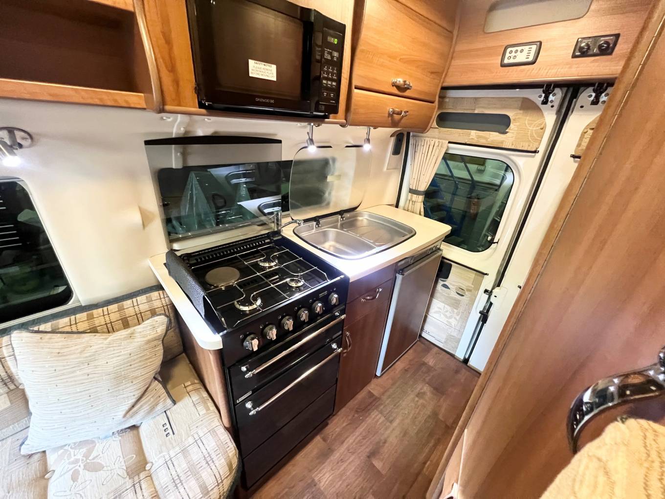 Introducing this fantastic example of an Autosleeper Dorset, This 2 berth, 3 seatbelt model is designed for those that like their creature comforts but love the flexibility of a smaller van. Open the side sliding door and use the electric slide out step to enter In the lounge there is a side sofa and a forward facing seat that has a 3 point seatbelt fitted. This area can make up two single beds or a large double bed. There are 2 tables. The Tinted side windows (with openers) and the wind up rooflight have integral blinds and fly screens. Curtains are fitted around the cab/ windscreen and rear windows. The kitchen has a stainless steel sink with folding mixer tap and glass lid. A Caprice built in oven with 3 gas burners and a mains electric hotplate, gas grill and oven beneath. Domestic 3 way powered fridge with freezer box plus a Daewoo microwave. A Whale gas or mains water heater provides hot water and space heater. Plenty of cupboards and cabinets for storage. To the rear the there is a wet room having a shower mixer with handset and shower curtain. A dropdown wash basin with mixer tap. A Thetford cassette toilet with electric flush.