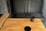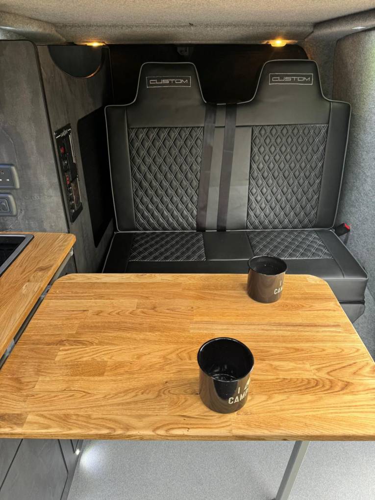 Double swivelling passenger seat can turn to face the rear and also has a very neat slide system to get closer to the Oak topped Table.
