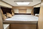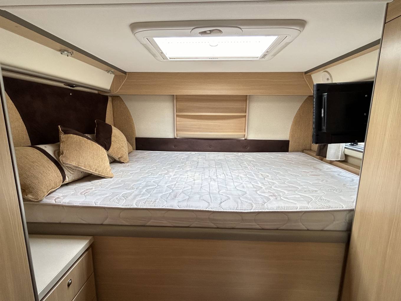 Step inside the motorhome and you are blown away by the sheer amount of living space. The layout comprises of a fixed rear transverse bed which you can get into very easily as there are a couple of steps by the bed so there is no need to climb up a ladder. There is a TV on a wall bracket in the bedroom and you have a huge amount of wardrobe and cupboard space for your clothes.