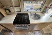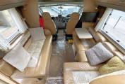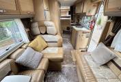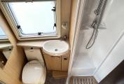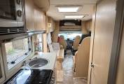 The mid-kitchen is generously equipped and has everything you need to conjure up great meals on the go. As well as an oven and grill there is a dual-fuel hob with an electric hot plate and 3 gas burners and even a microwave. The full size fridge has automatic selection which chooses which power source to run off without you having to do anything. There's load of cupboard space for your pots and pans and crockery so this is a motorhome that you will enjoy cooking in.