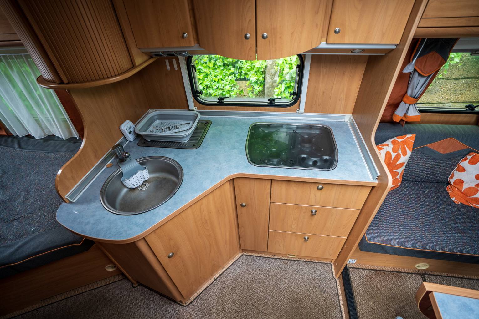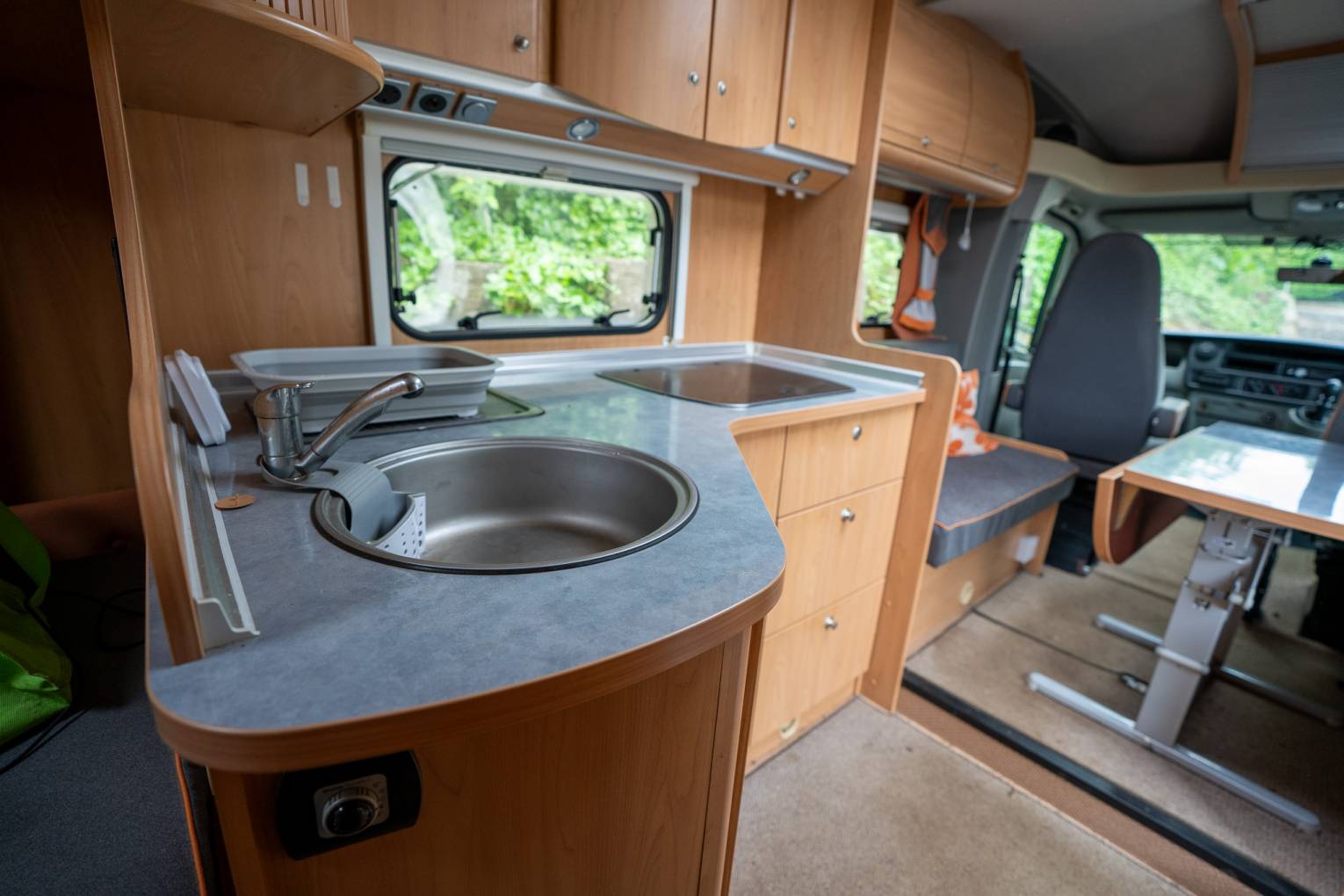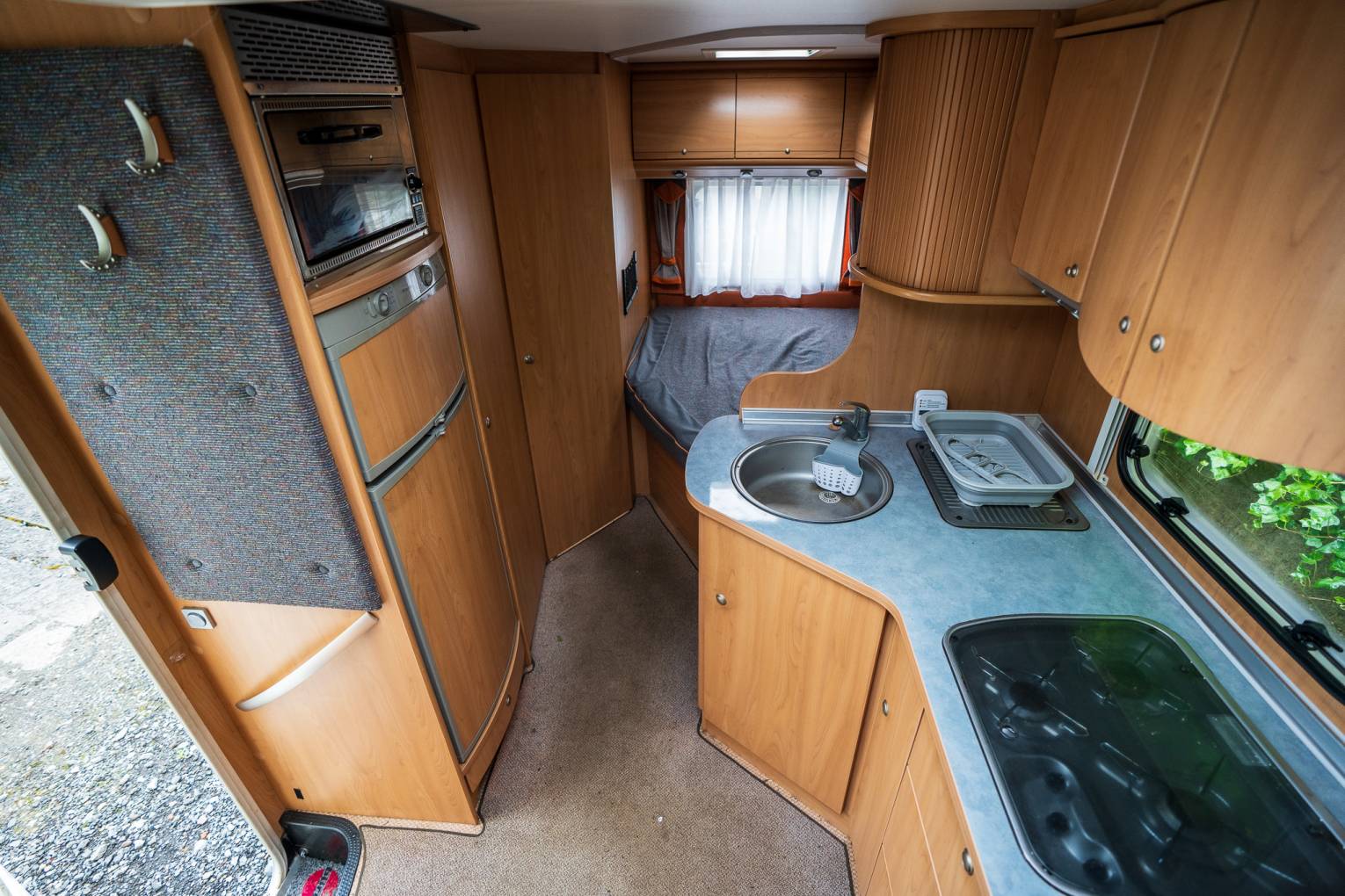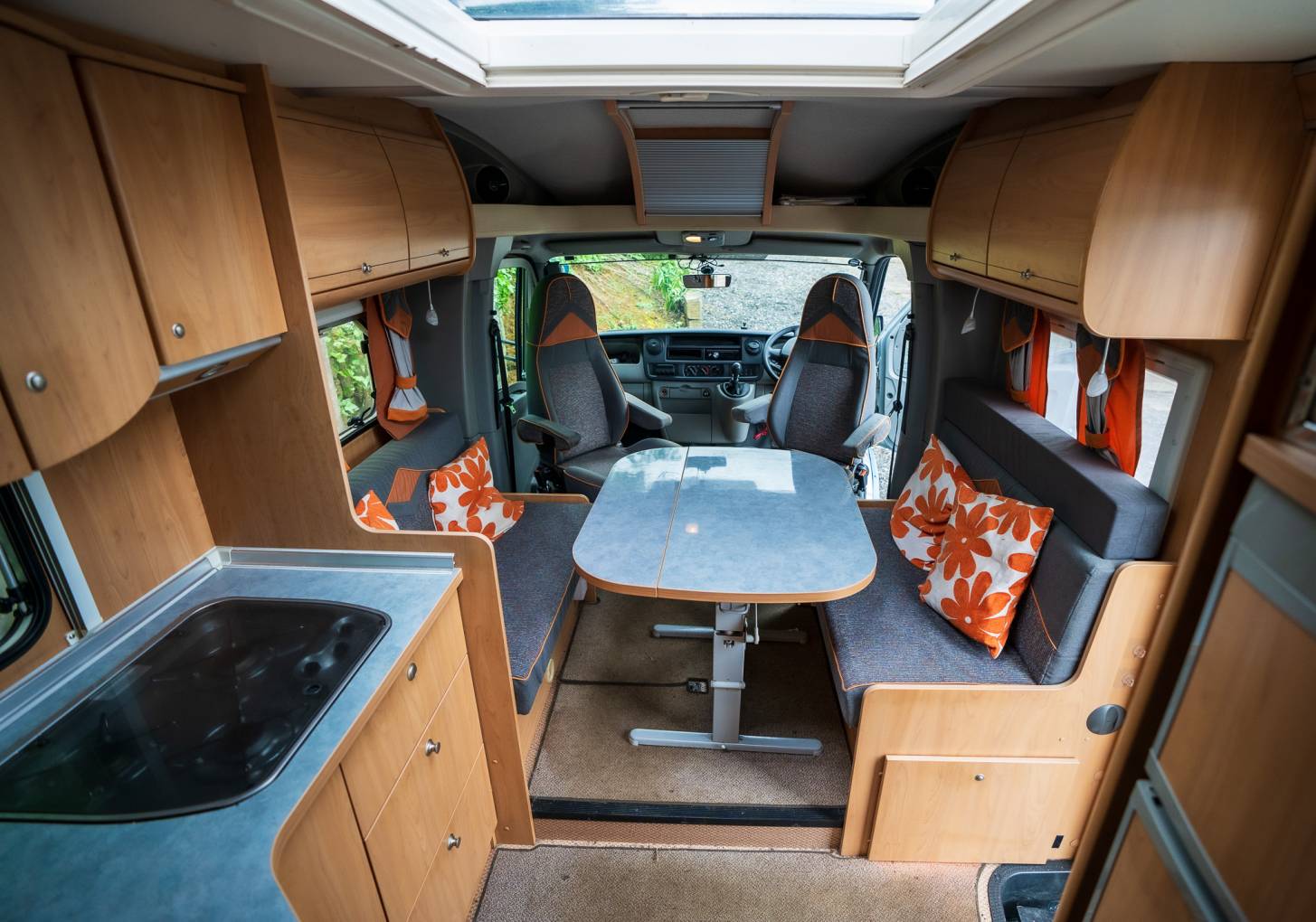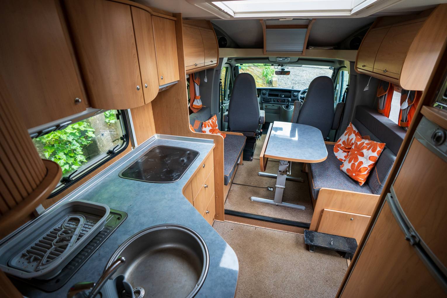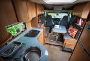 Upon entry through the driver’s side habitation door, you are greeted by the main kitchen area featuring a three-burner hob, expansive sink, ample worktop space, and abundant cupboards and drawers. Directly opposite, to the left of the entrance, sits the large fridge, separate freezer, and a Smev oven and grill. Just ahead of the entrance, the roomy lounge area includes two inward-facing sofas, twin swivel cab seats, and a detachable table with a foldaway section for additional lounging space.
