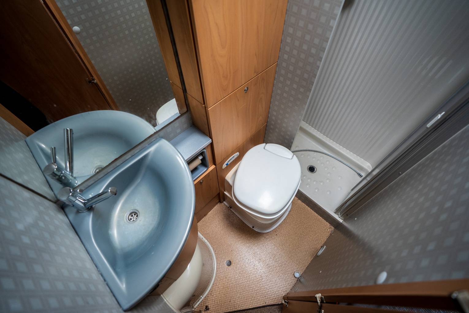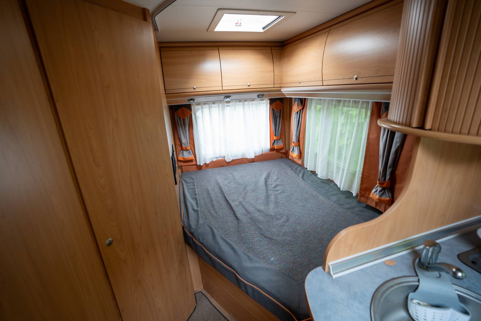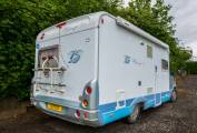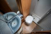 The rear of the motorhome houses a French bed in the nearside corner, offering a substantial storage area beneath, which is also externally accessible. The opposite corner contains the washroom, equipped with a sizeable separate shower, washbasin, Thetford swivel bowl toilet, and copious amounts of space in the cupboards. The motorhome's domestic power is supplied by two 110 Amp batteries. The cab area is outfitted with air conditioning an inbuilt radio and Blaupunkt Embedded Speakers. Extras include loose-fit carpets, a mains electric lead, and a bike rack capable of holding two bikes.