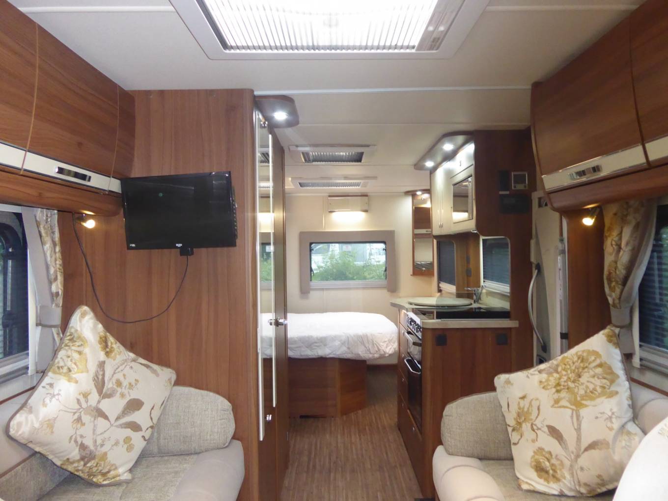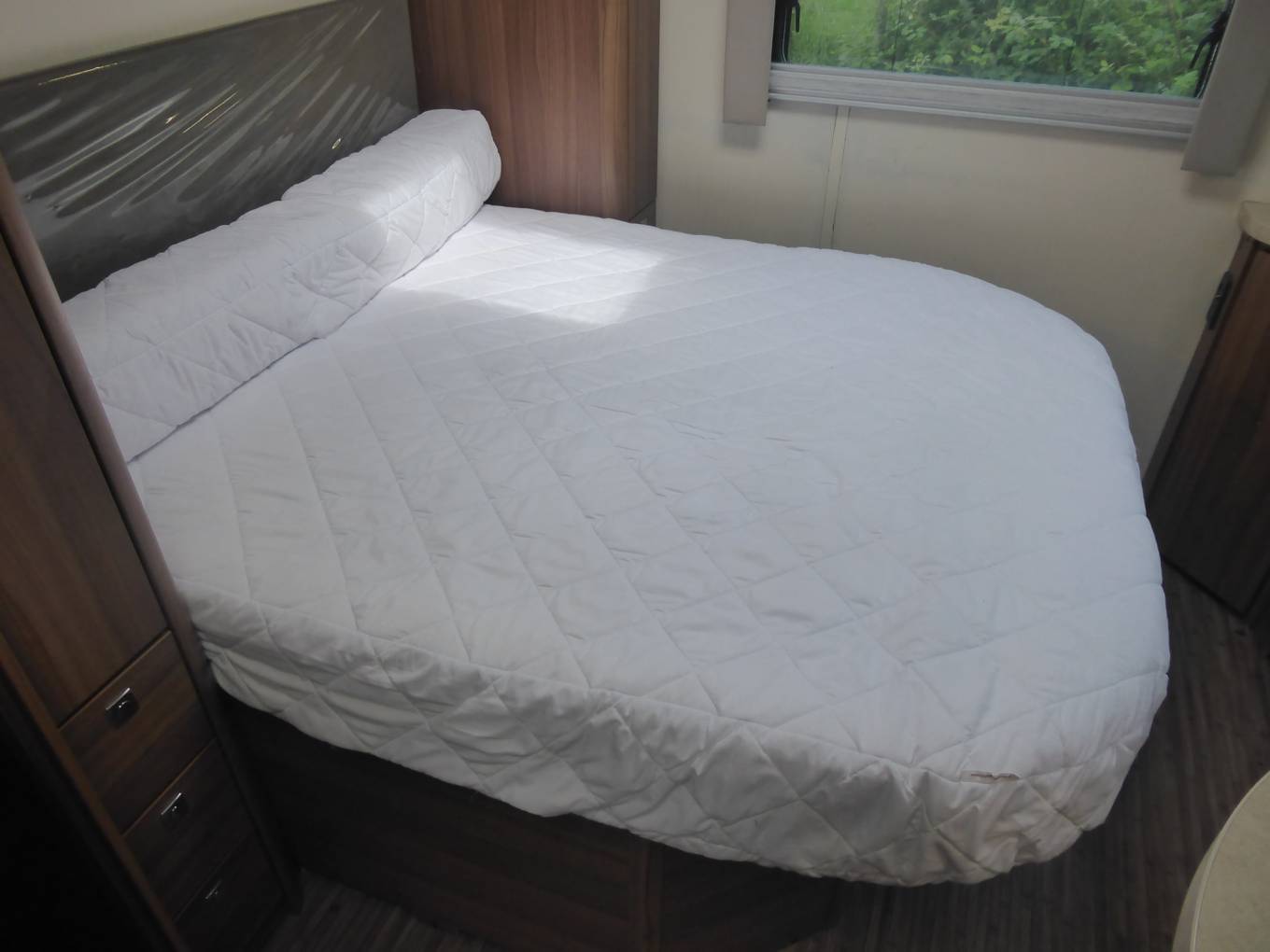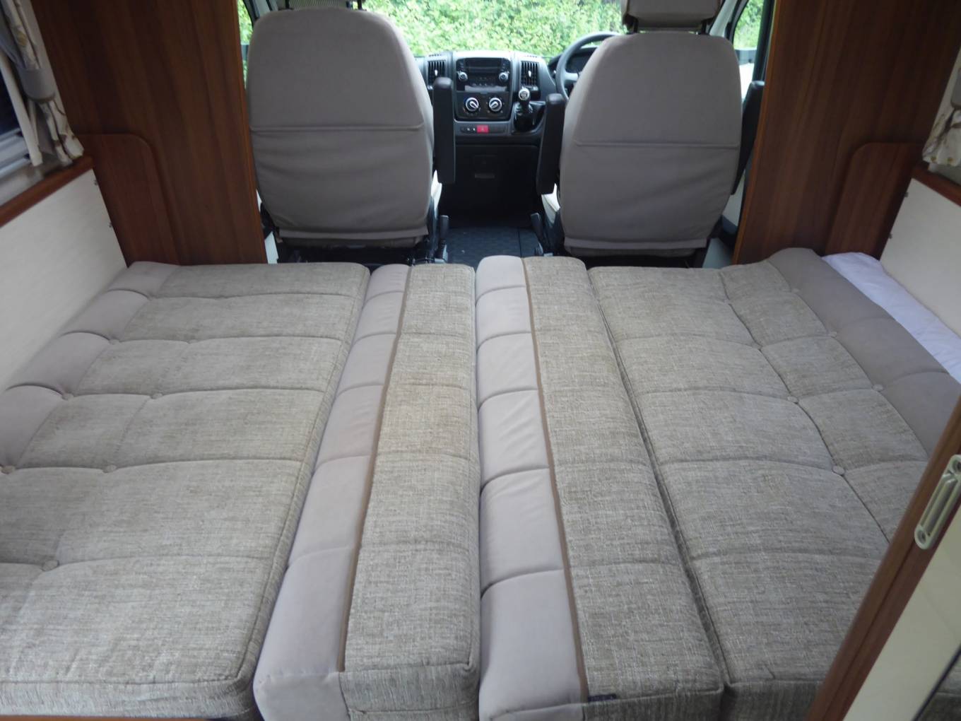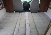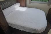 At the rear of the vehicle is a transverse island bed with wardrobes either side of the offside bed head.