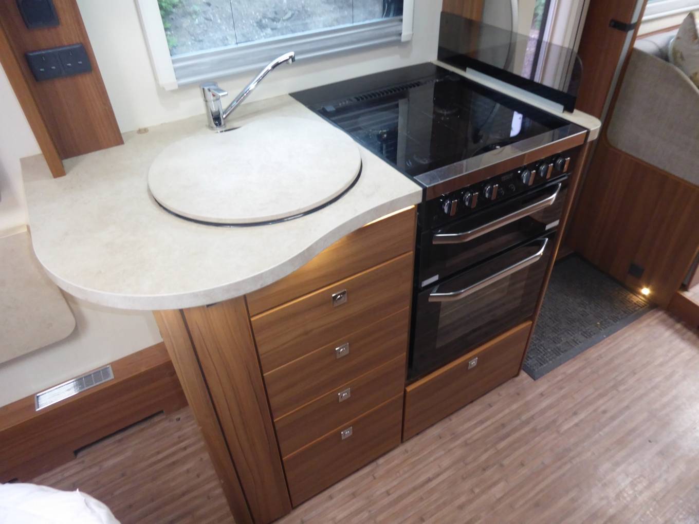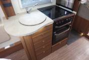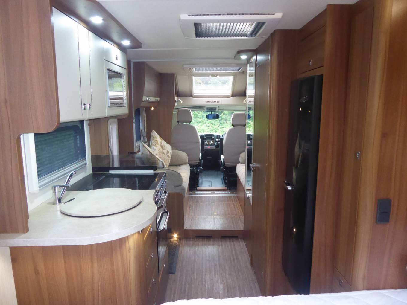 Beyond the nearside habitation door there is a kitchen comprising a gas oven, a grill, a hob (with 3 gas burners and an electric plate), a microwave, and a sink. Opposite the sink is a tall fridge with a freezer box.