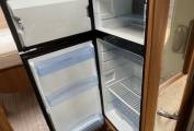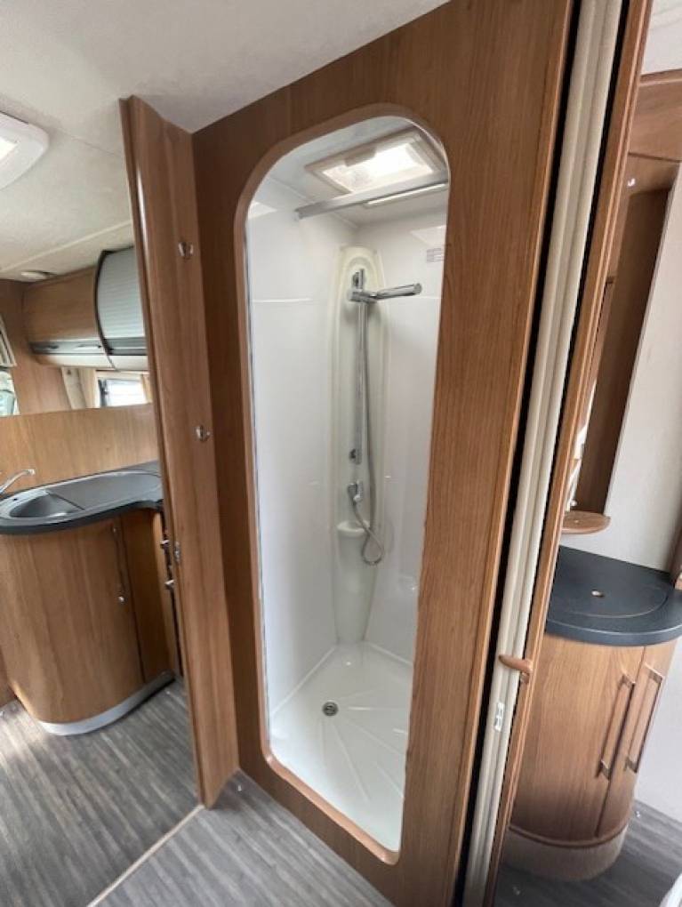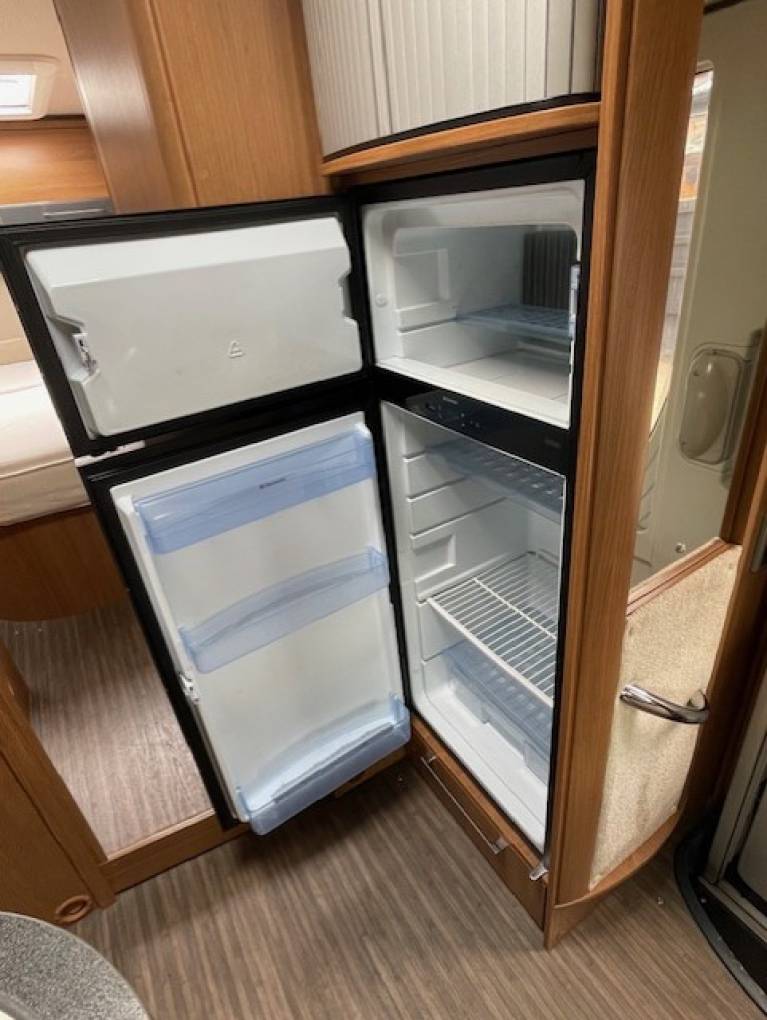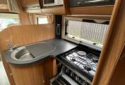 The spacious living area consists of an L shaped lounge with two forward facing travelling seats and a separate bench settee. This area can convert into 1 of the 3 double beds available on board. The large fully equipped kitchen comes with a large 3 way automatic fridge and separate freezer, built in microwave, Oven, separate grill, dual fuel hob with electric hotplate and 3 gas burners, Kitchen extractor fan, kitchen sink mixer tap and lots of storage cupboards with pull out storage baskets.