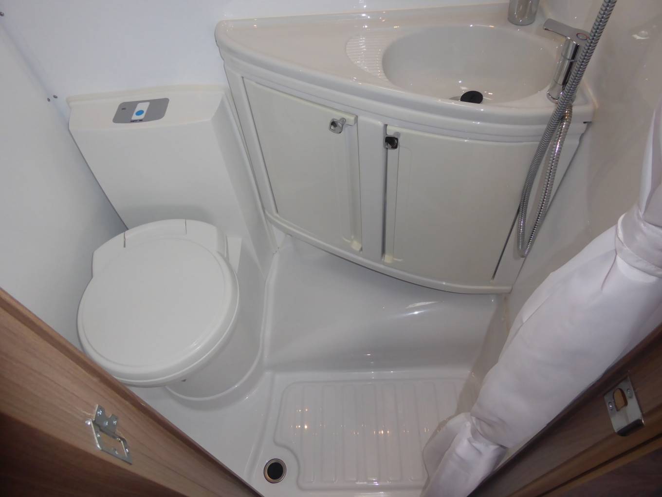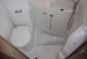 Behind the dinette is the wetroom, with a toilet, a hand basin, and a shower.