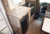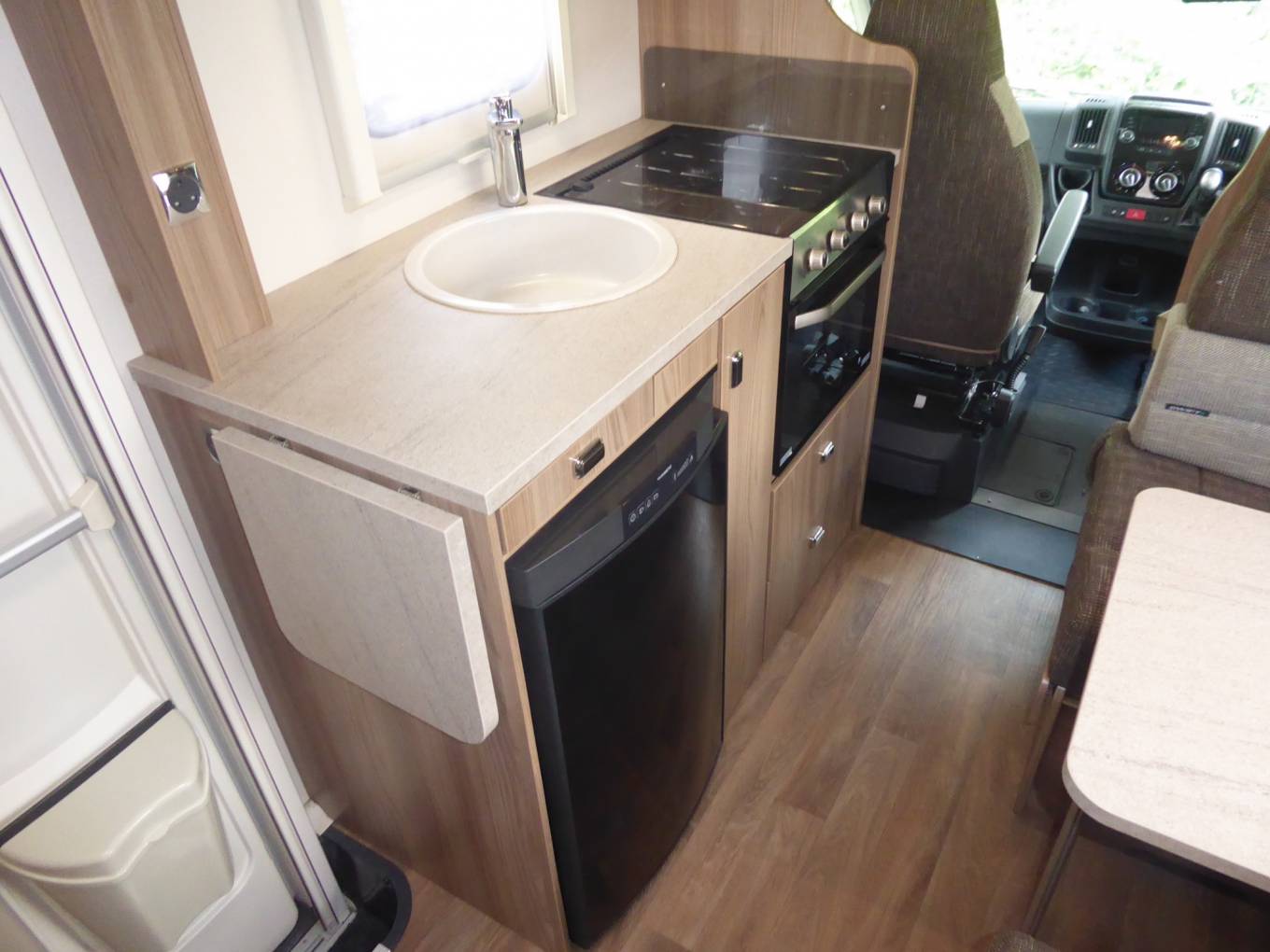 Opposite the dinette is kitchen, which features a hob with 3 gas burners, a combination oven/grill, a microwave, a fridge with a freezer box, and a sink.