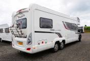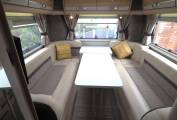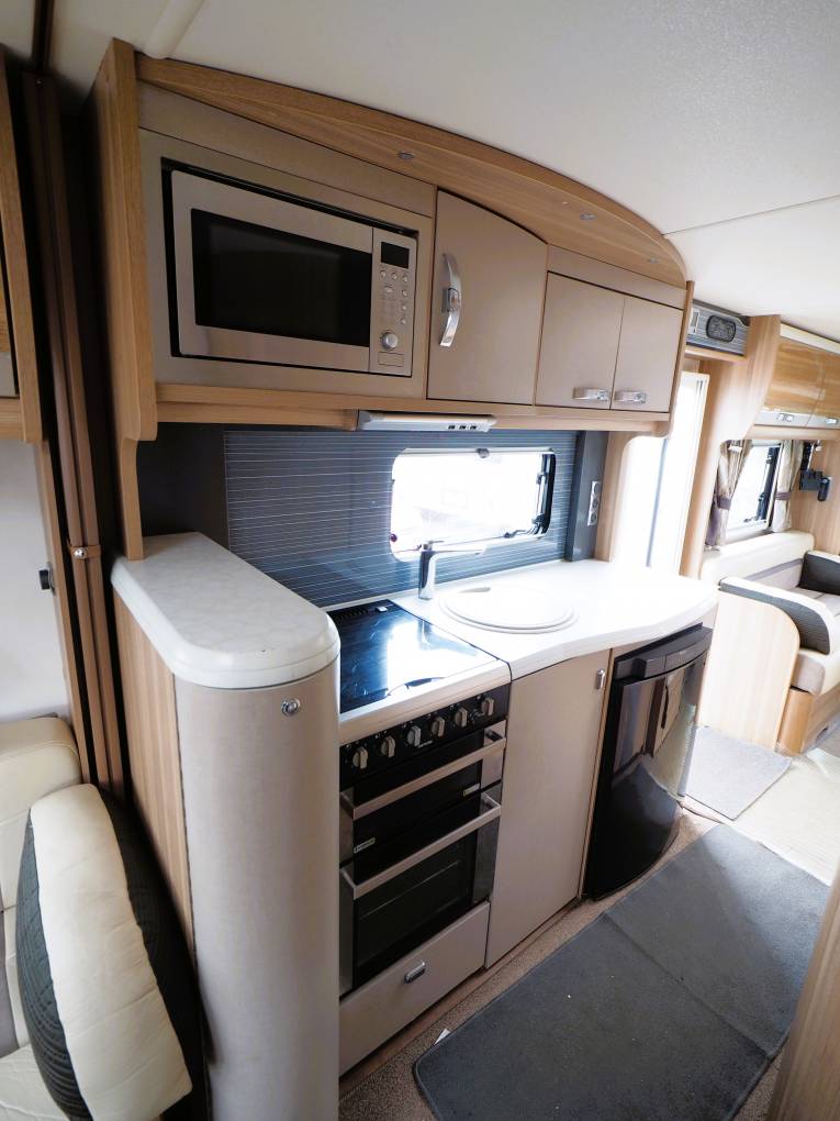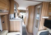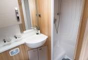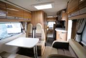Centrally there is a large wardrobe with spacious washroom to the side comprising cassette toilet, washbasin and vanity with storage and a separate shower cubicle. Opposite, the galley kitchen has all you need to satisfy even the most keen of cooks with duel fuel hob, oven, grill and microwave. In addition there is a bowl sink with splash-back and under counter fridge with freezer box along with cupboard and overhead lockers for storage.