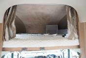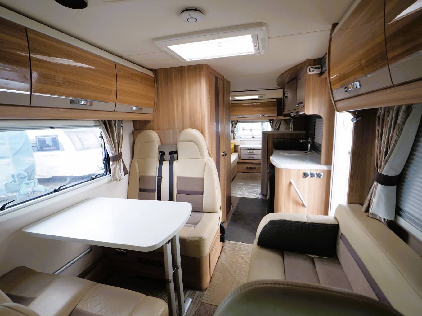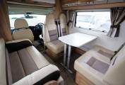 A front dinette provides a second seating and eating area and also converts to provide another large double bed. The front and rear facing seats come with three point safety belts to safely allow the travel of 4 rear passengers in addition to the driver and passenger up front. A second TV point is fitted and overhead lockers providing further storage to both sides. To complete the 6 berths there is a good sized, overhead cab, fixed double bed with ladder access.