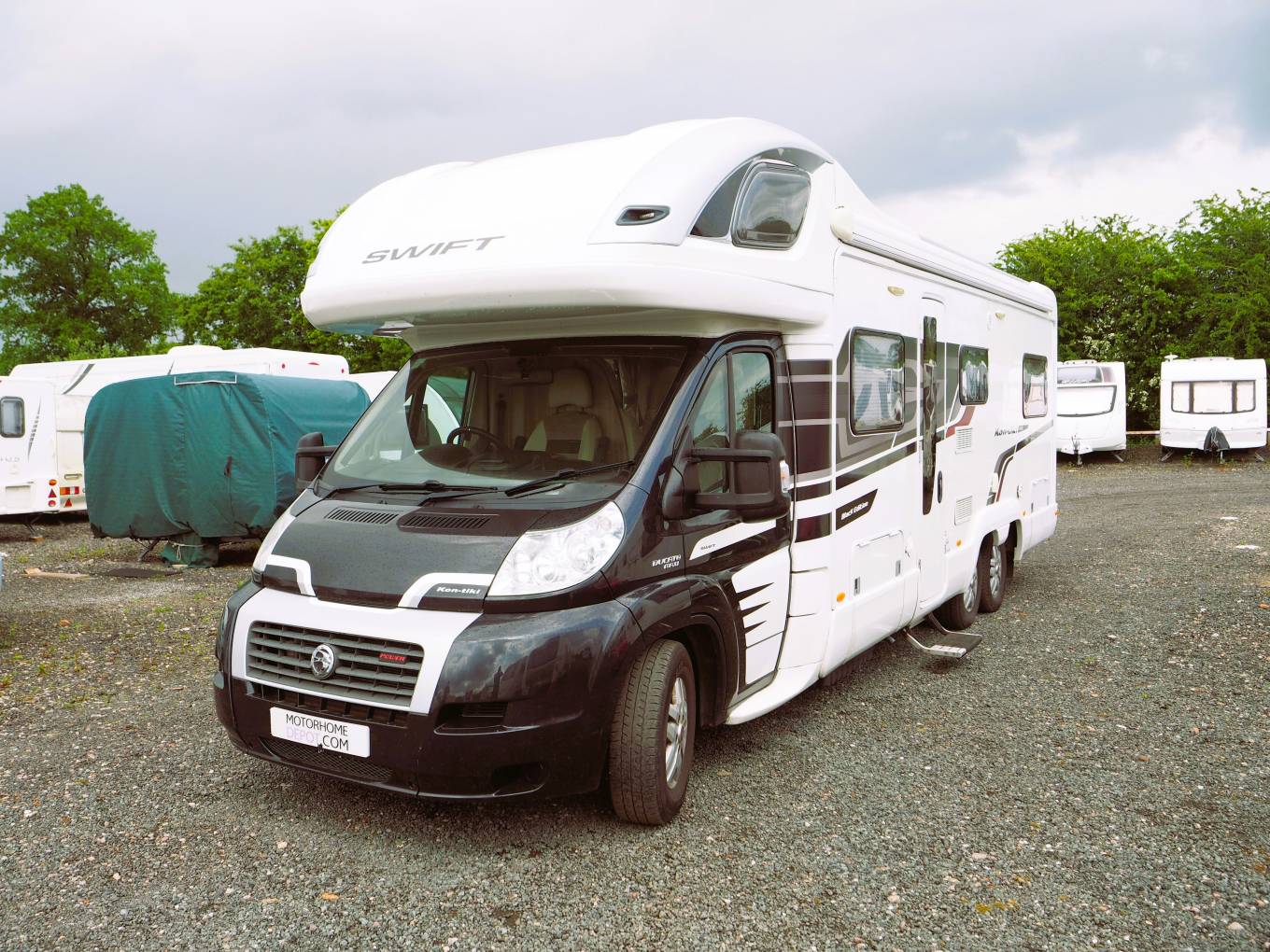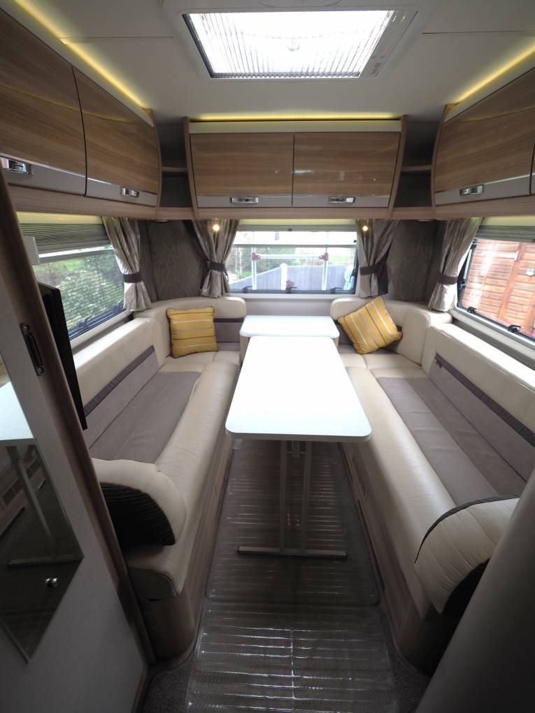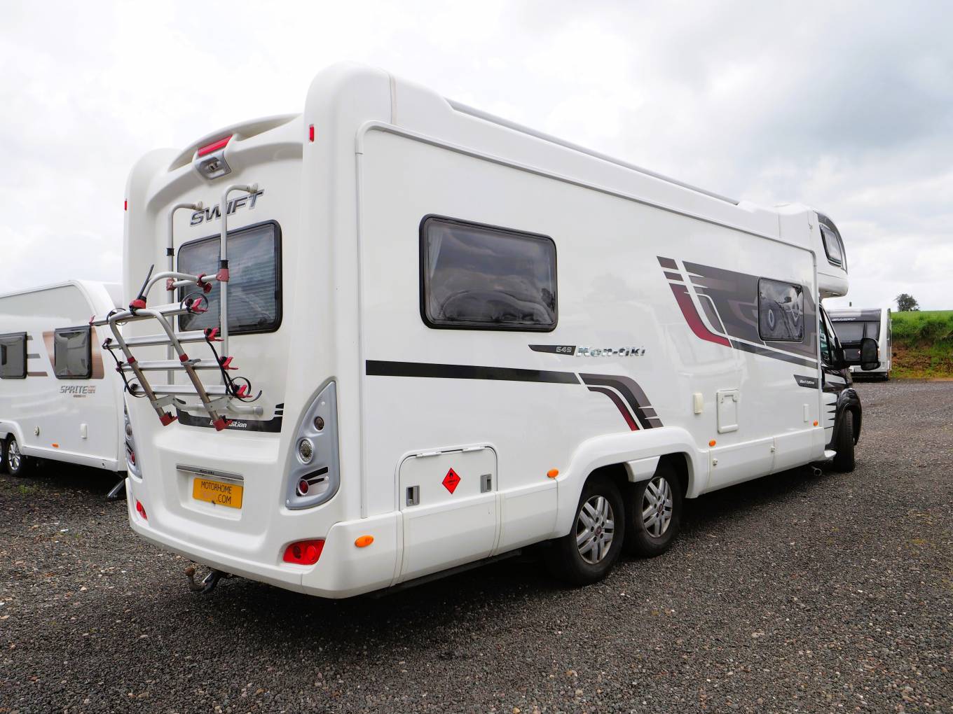 Spacious and comfortable and room for six, this popular and luxurious Swift Kontiki 649 offers home from home comforts. Located near Newport, Shropshire, this is ideal for couples who love space and for families who need space. The layout provides a large rear lounge with additional storable table, TV point, overhead locker and under sofa storage with a central coffee table and drawer space. Converts to two large single beds or a generous king size bed and the area can be made private with the pull across concertina blind. Lots of natural light from the large windows to three sides and overhead skylight. All main windows and skylights fitted with blinds and flyscreens with Remi Concertina blinds to the cab to provide night-time privacy.