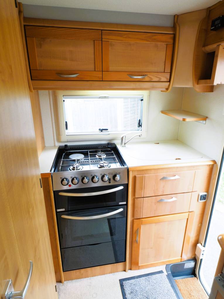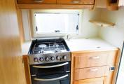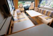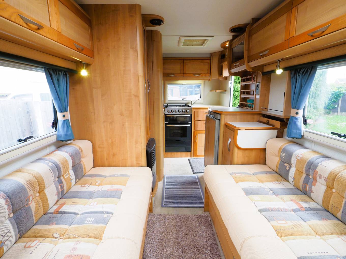 The layout provides 2 travel seats & a 4 berth layout with a good sized double (6'6" x 5'). There is also an overcab double bed (6'6" x 4'). As a lounge space there are two 5' sofas running either side of the habitation area & with the swivelling front passenger chair, provides space for up to 5 adults to relax. Storage on both sides with overhead lockers & under sofa cupboards.