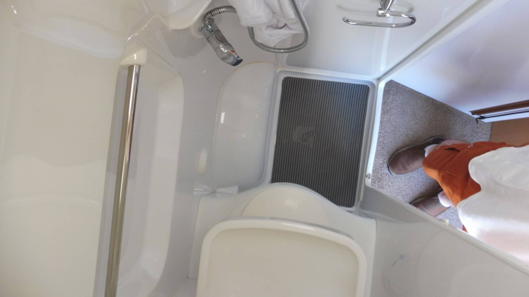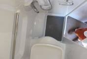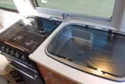 At the rear of the van there is a side kitchen with dual-fuel hob, oven, grill and 3-way fridge. Opposite you find the compact washroom with toilet, foldable sink and shower.