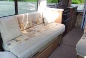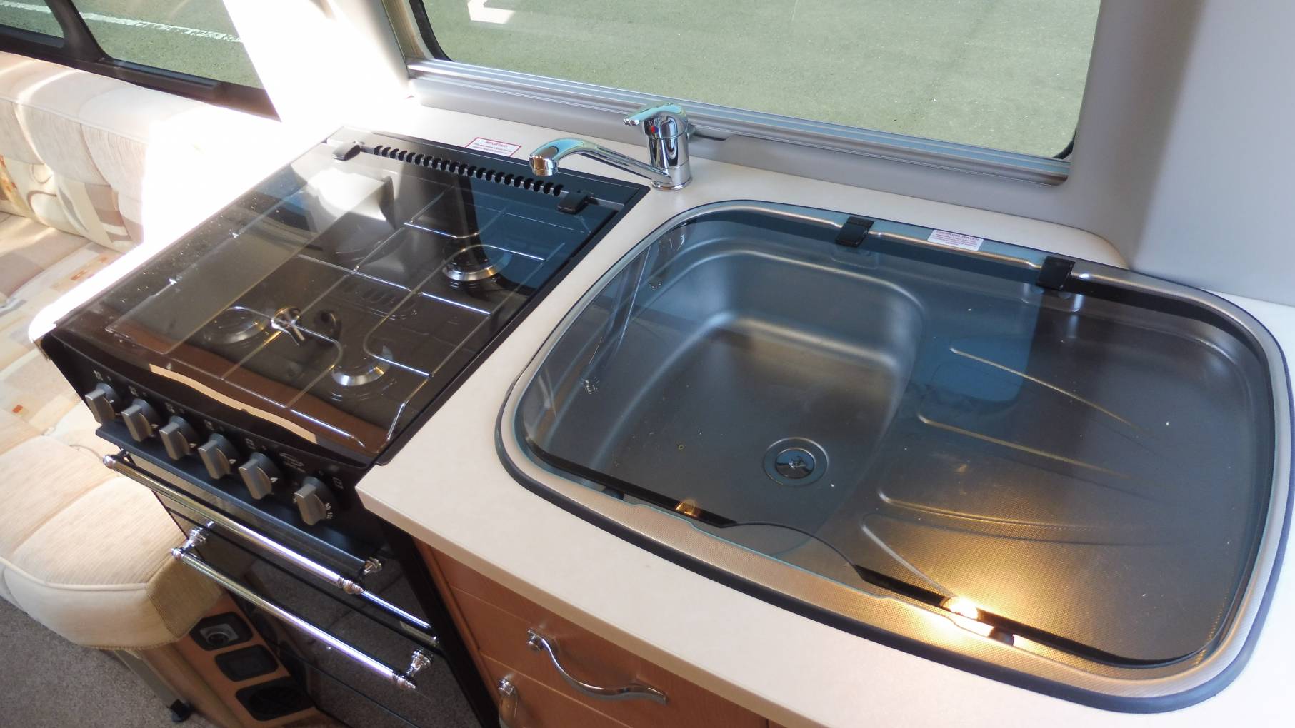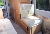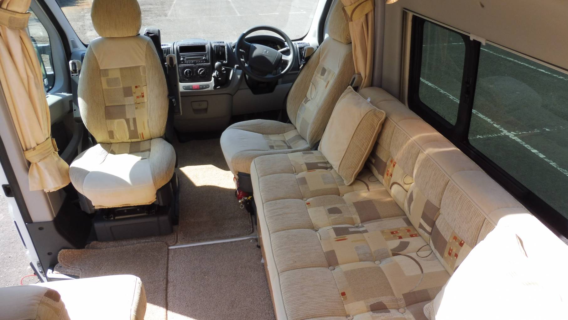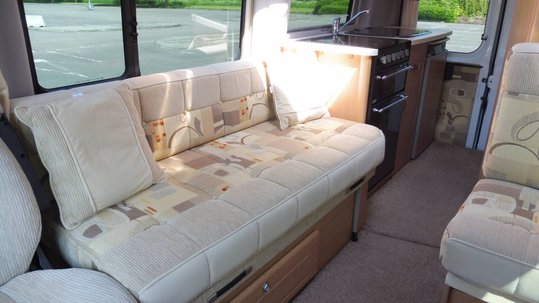 These Autosleeper Symbols are the stalwarts of touring for couples. The centre dinette is bright and airy aided by the large skylight and cream coloured furnishings, which are immaculate. For added comfort the van is fully carpeted with a spare set to boot. Both front seats swivel into this area which along with the forward-facing travelling seat and side sofa provide comfortable seating for 5 people.