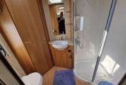 Finally to the rear is the full width bathroom which consists of: cassette style Thetford electric fresh water flush toilet; central white sink with chrome mixer tap; large hanging wardrobe with drawers below; separate shower cubicle with Perspex doors to close.
