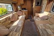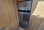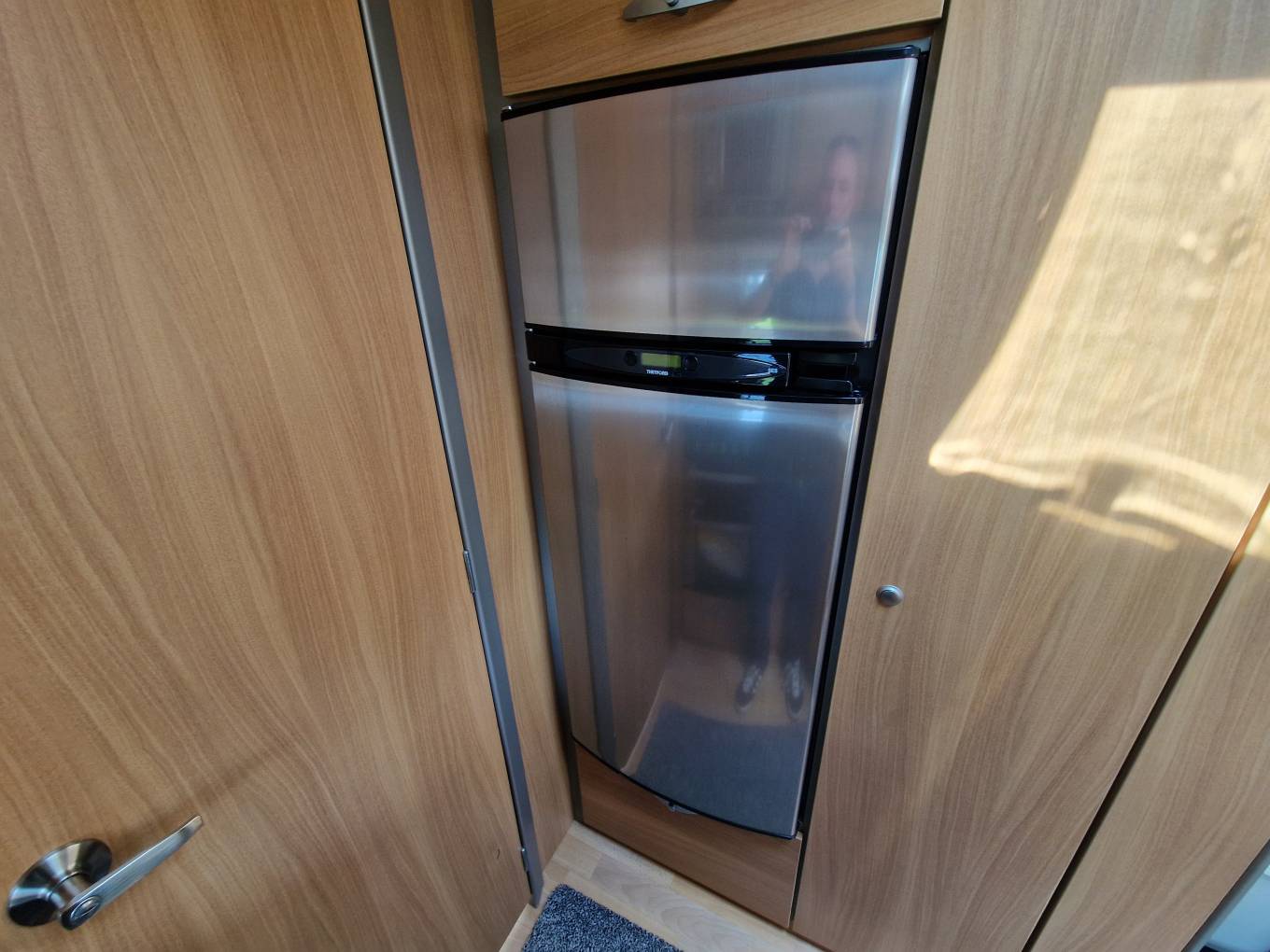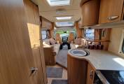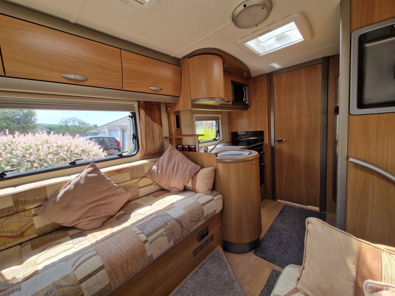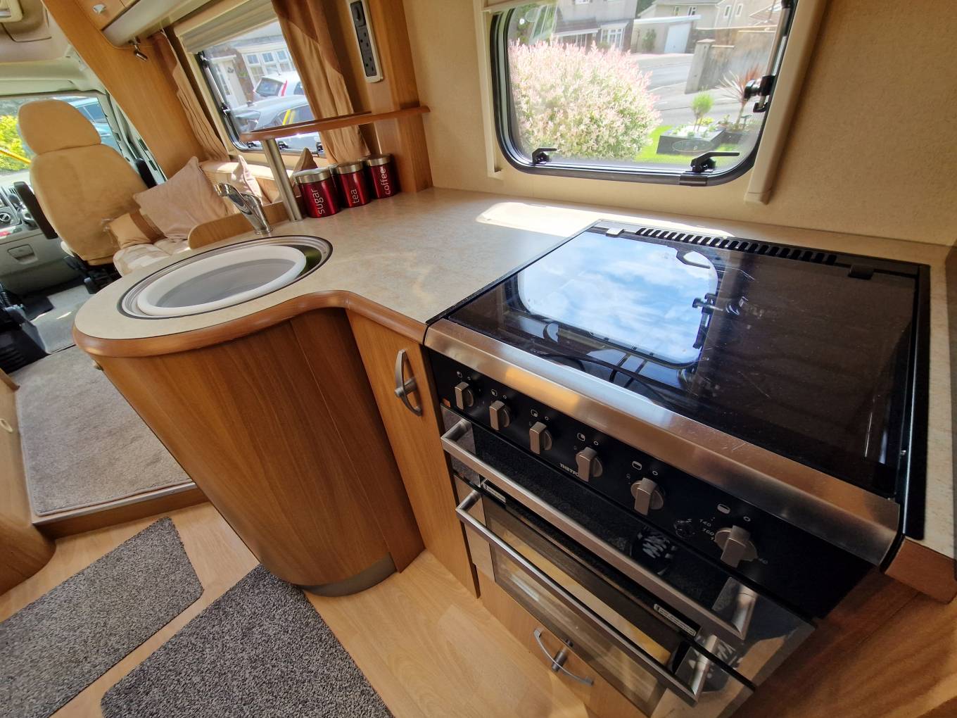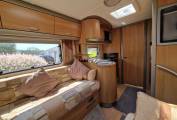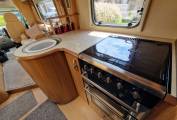 The Kitchen opposite the Habitation door consists of a sink with chrome mixer tap; black enamel 4 burner hob, 3 gas and one 240v hotplate for when you are plugged in on site. Above there is a Microwave and plenty of cupboard space for all your cooking utensils & holiday provisions. Below the counter is a full size Thetford Oven with grill. Opposite a large Thetford absorber style fridge with separate freezer box this can be powered by 240v, 12v or gas depending whether you are on the move or wild camping.