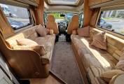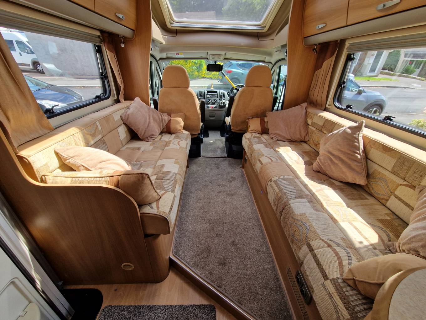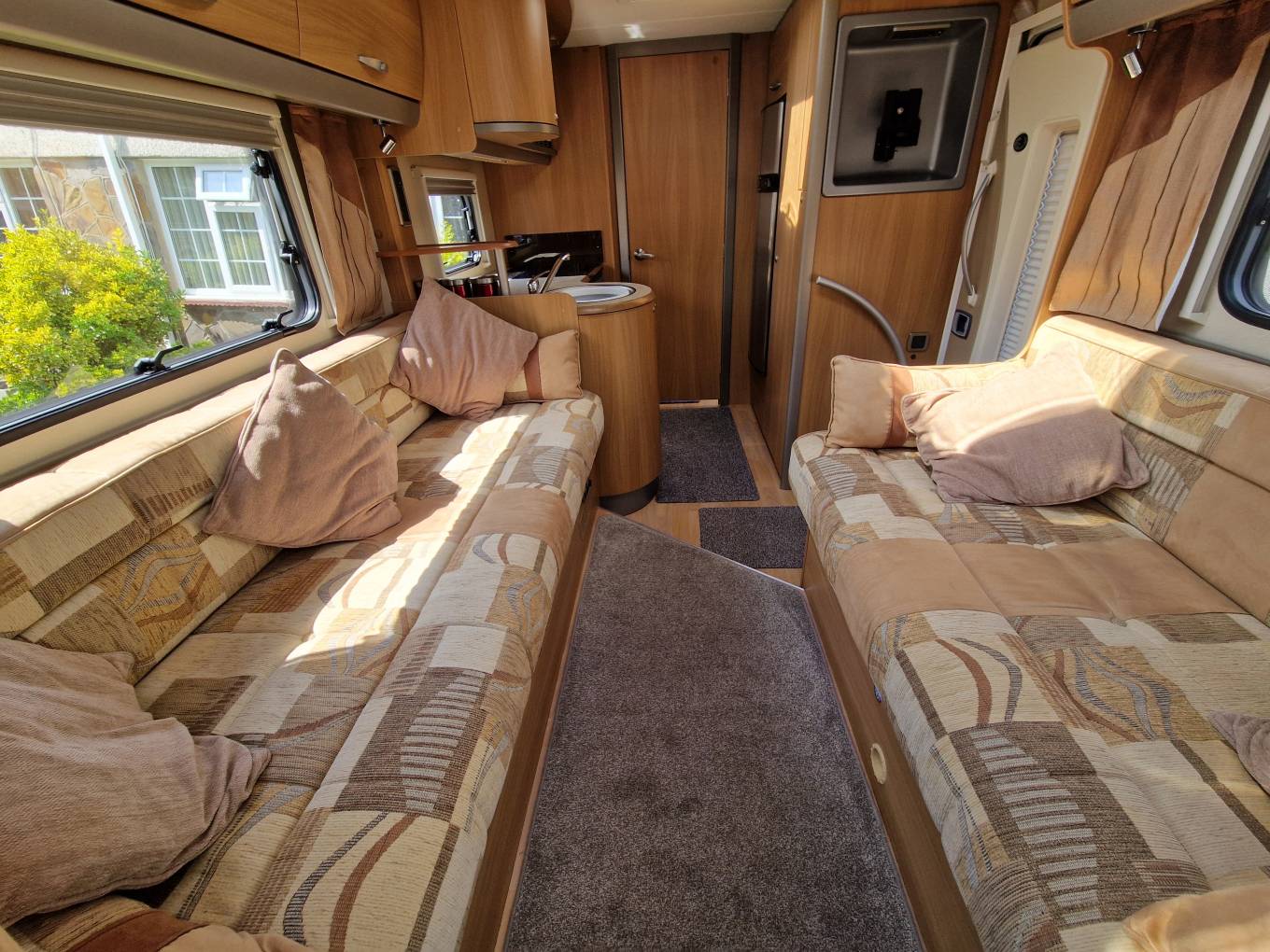 We enter the motorhome on the nearside and immediately to the left is the dinette which consists of two opposing sofas. The table stows away when not in use & the front chairs also rotate to join this area,so you could comfortably seat 6 if entertaining on site. At night this area pulls together to make a large double bed using a combination of cushions as the mattress. Alternatively it can be used a twin single beds by using a sculpted infill cushion for the shorter of the two sofas and the passenger front seat.