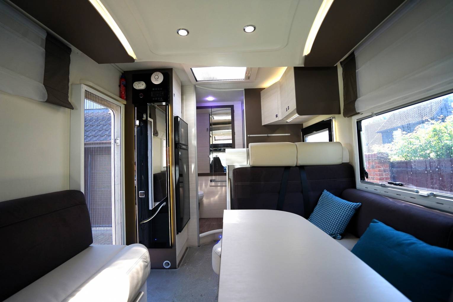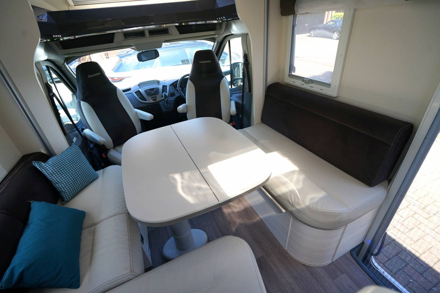 and opposite is an L shaped sofa. The table folds in half for ease of stowage