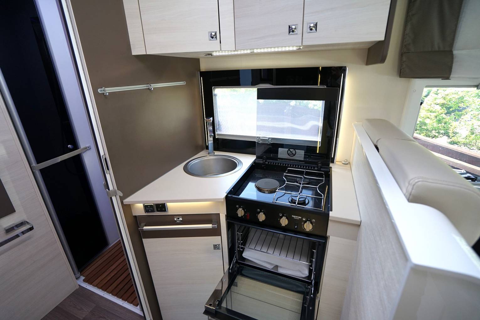 you are plugged in on site or wild camping. There is a TV compartment above
