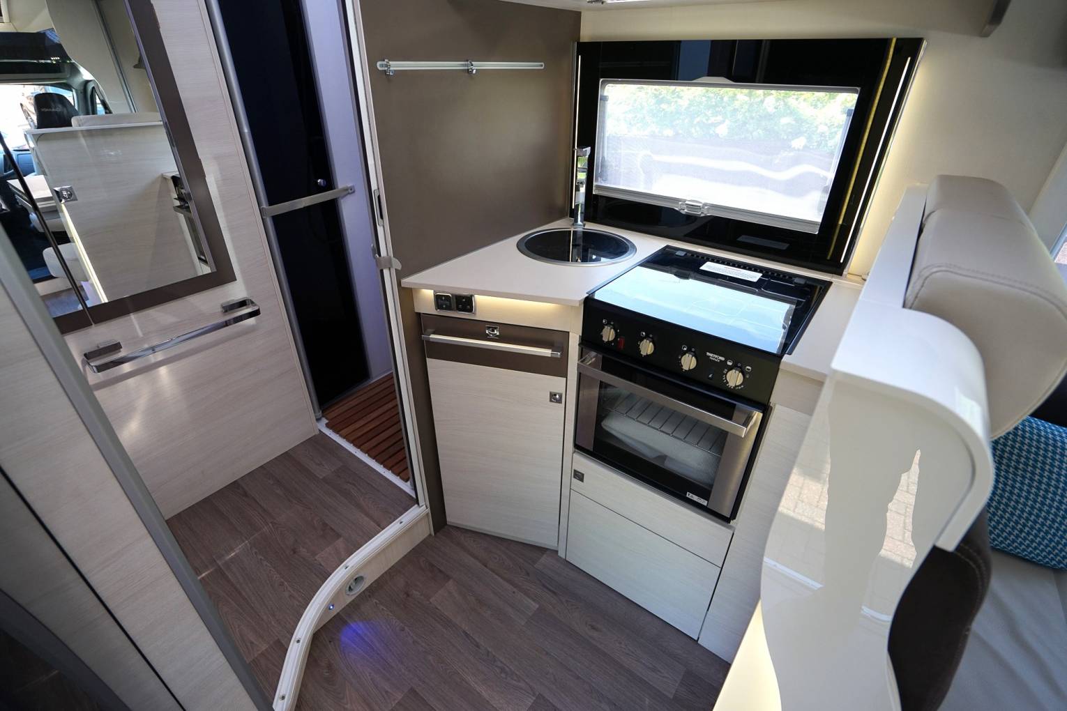 the right is the dinette which has a 2 seater sofa next to the habitation door