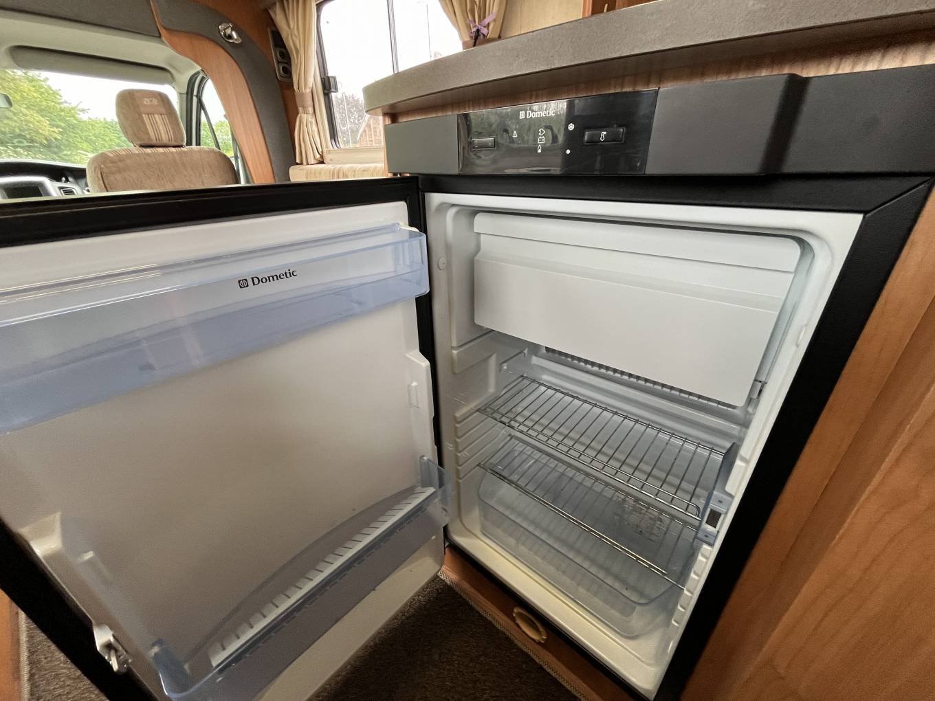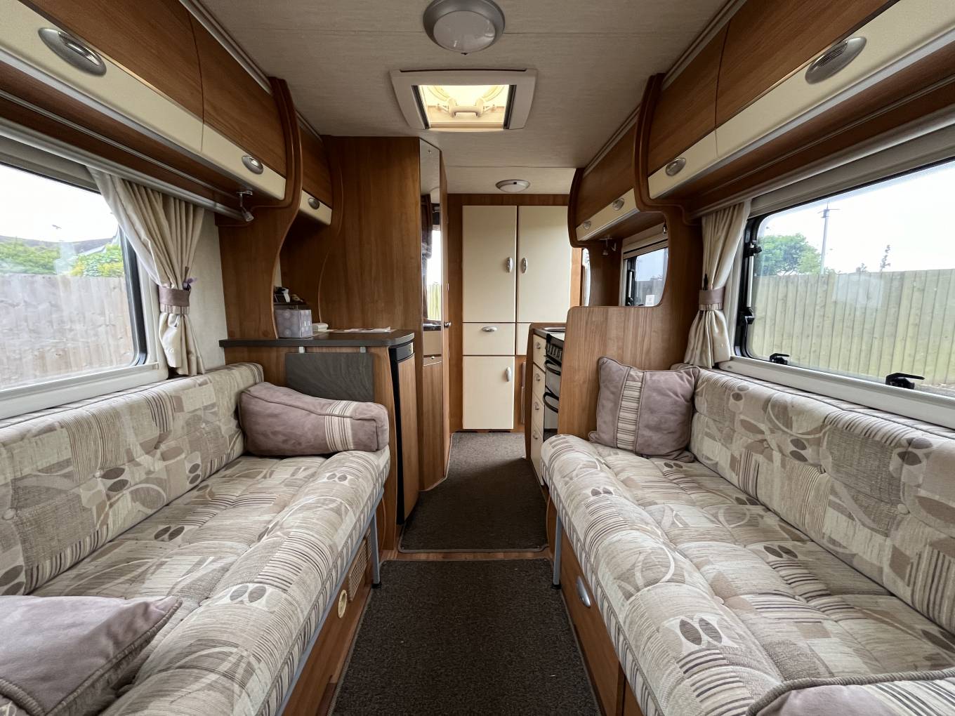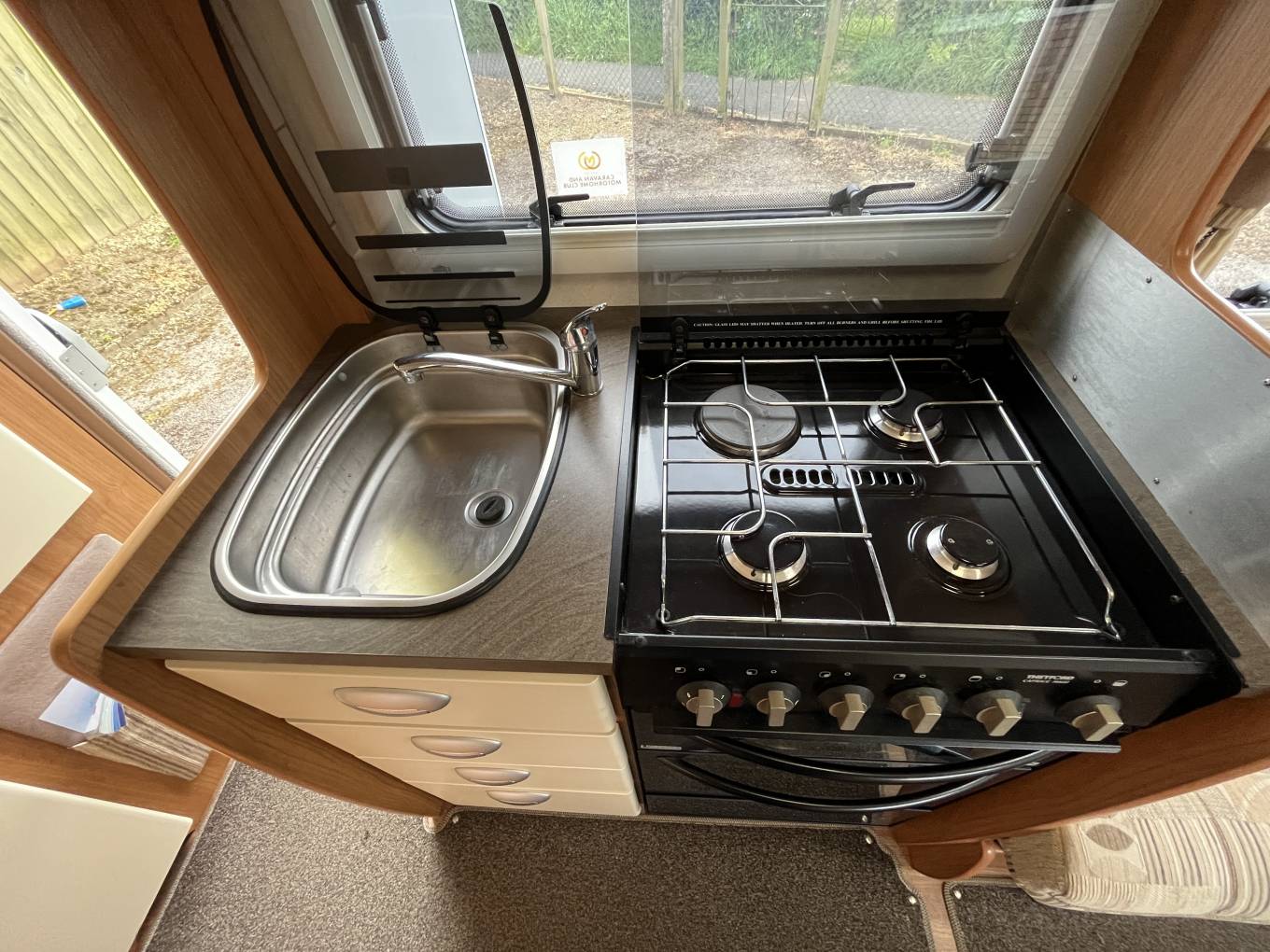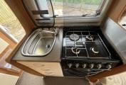 The kitchen area is next, equipped with everything you need to make preparing/ storing food easy and a pleasurable experience There is a hob with 3 gas rings + and electric hob which is great to use when your plugged in on site as well as Grill & Oven. There is also a Fridge/ Freezer to make the storing of food convenient.