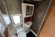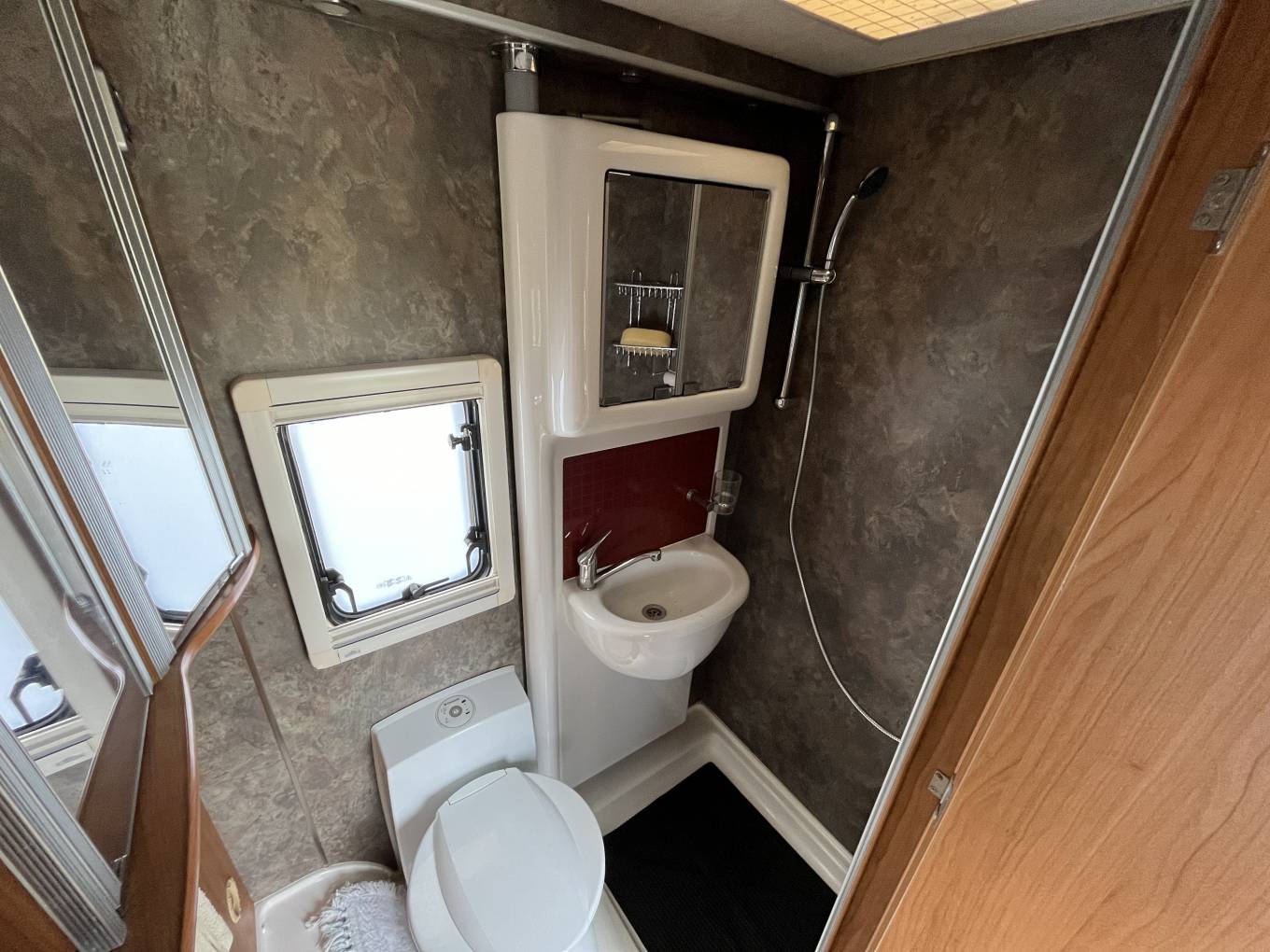 As you enter the motorhome you have ample wardrobe space on your right hand side which then leads on to a well sized bathroom area including toilet, sink and shower giving plenty of room to move around