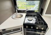 grill, gas hob with 3 gas burners, sink and large automatic 3-way fridge and