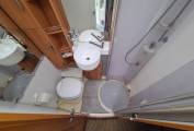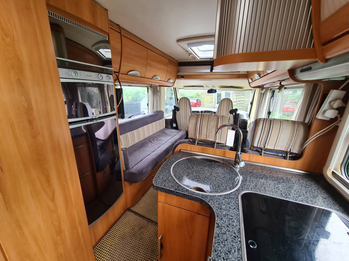Towards the rear of the motorhome you will find an L-shaped kitchen with 3-burner hob, sink with drainer and large fridge with separate freezer. In the rear corner you will find a good-sized washroom comprising vanity sink unit, cassette toilet and separate shower cubicle.
