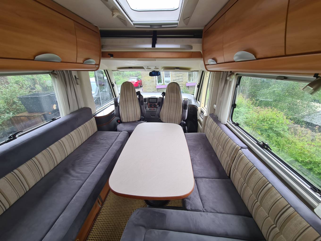 Sleeping accommodation is provided through the ubiquitous A-Class drop-down double bed over the cab area and is supplemented by converting the lounge area into a further small double plus a large single.
