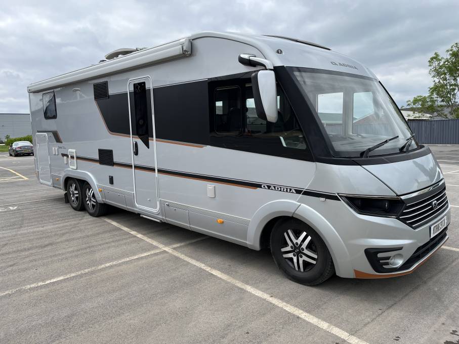 Adria Sonic Supreme 810SL, Luxury 4 Berth A Class with End Bedroom, Large Garage and Automatic Self Leveling System. This motorhome was registered June 2020 with one previous owner, fully serviced, current hab check, 11,176 miles and in excellent condition throughout. It is built on the Fiat Ducato with automatic gear box 180bhp engine and 5,000kg gross vehicle weight.
