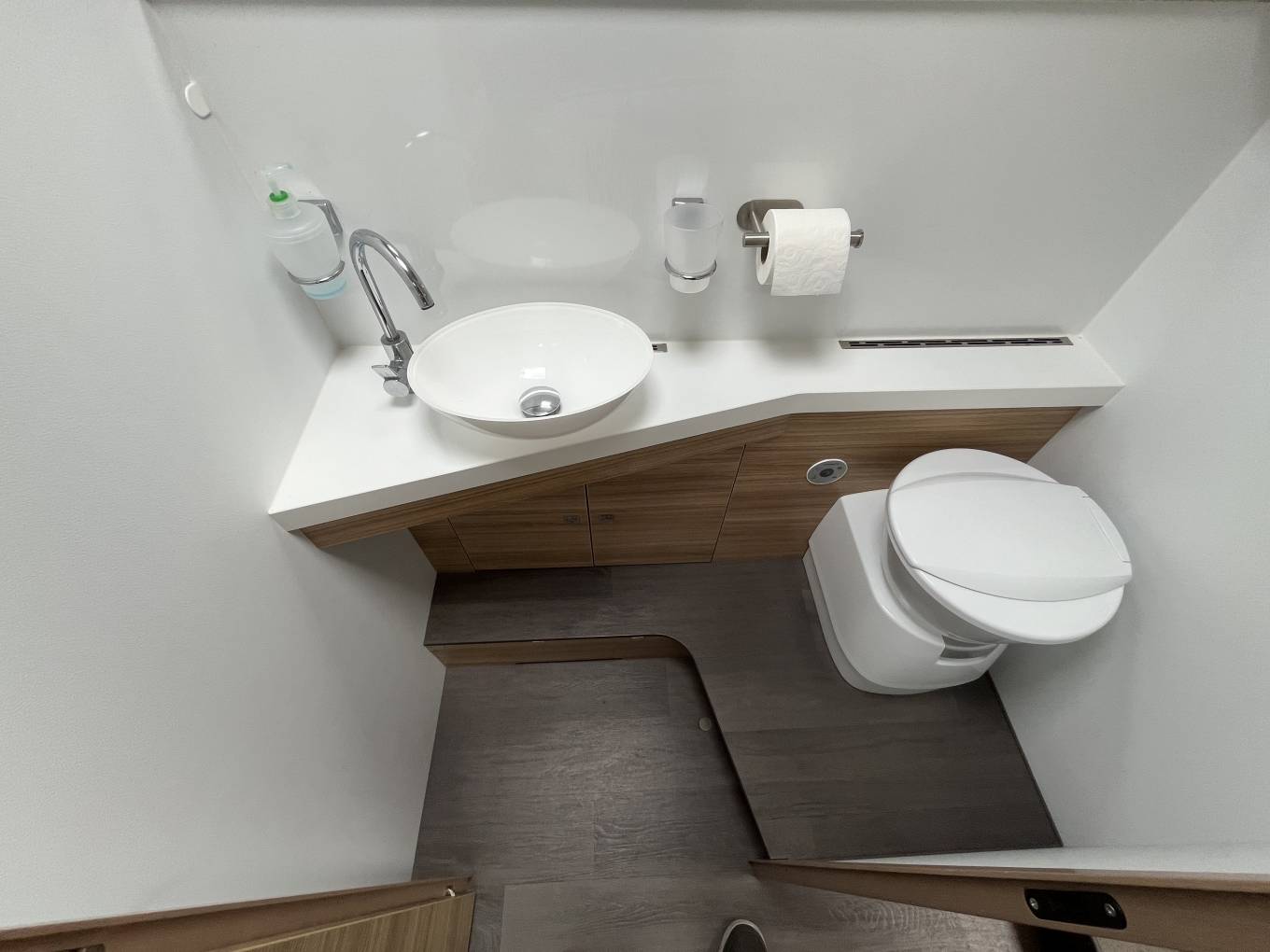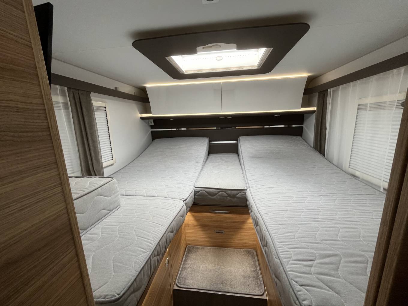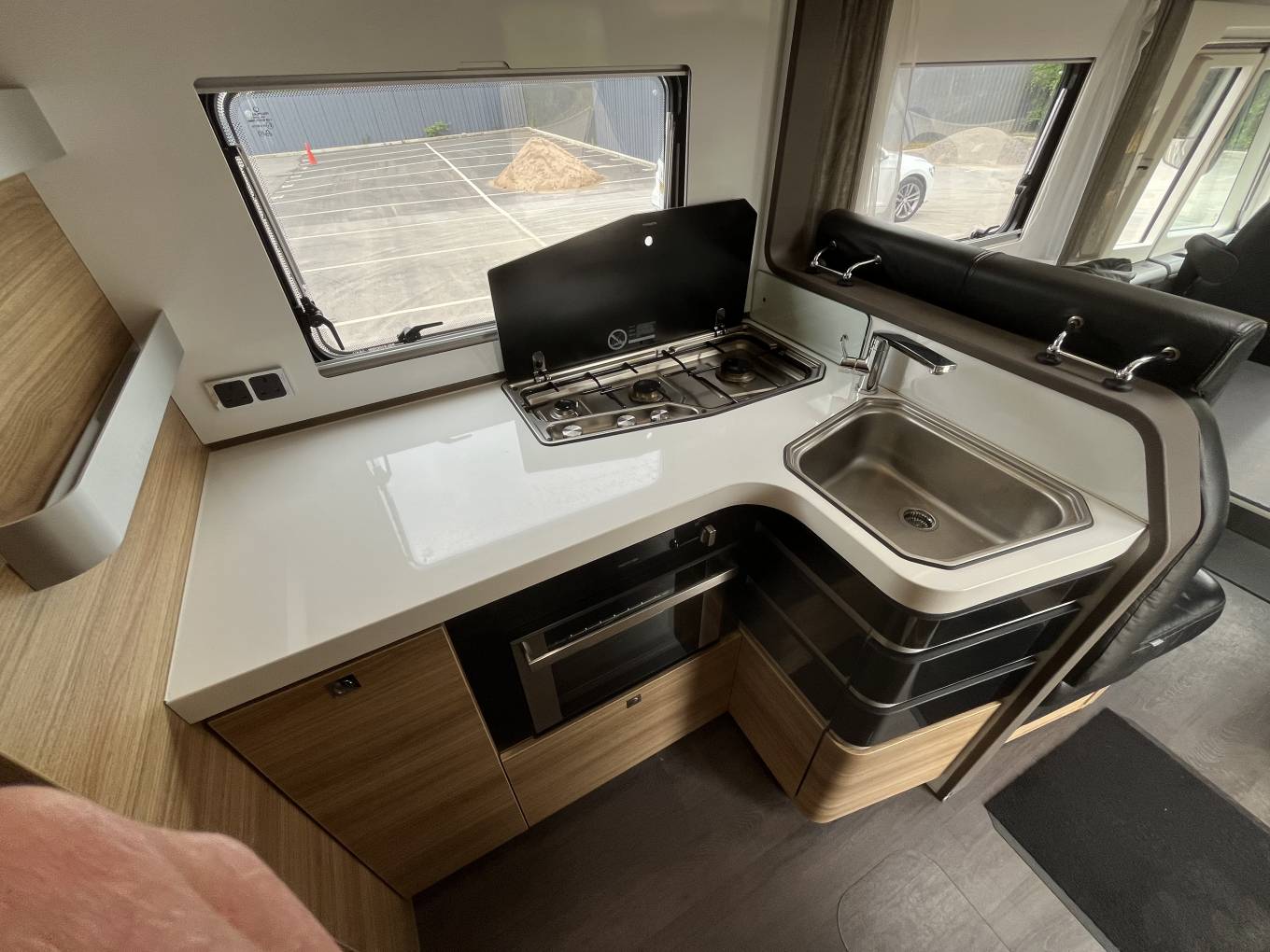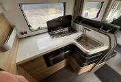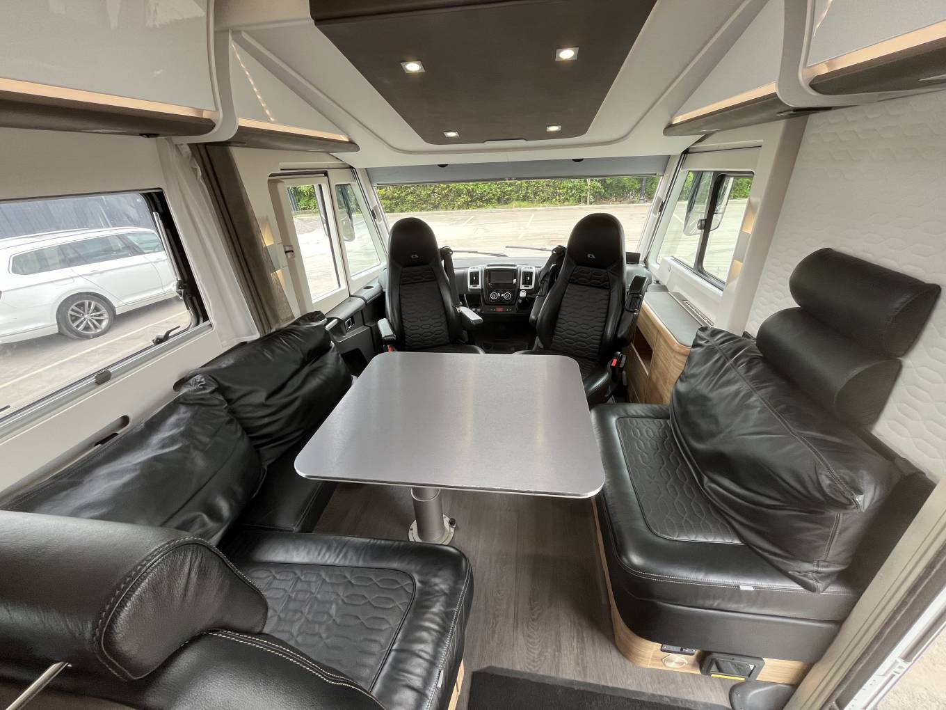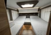 The layout consists of a rear bedroom with 2 single beds that can be made into a large double, under this is the garage which is large enough to take mountain bikes. Forward from the bedroom is the bathroom with separate shower which can be closed off the make an en suite and in the centre is a well equipped kitchen. At the front is the lounge area with settees finished in leather, 2 captains seats and an electric drop down double bed.