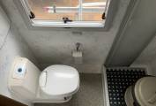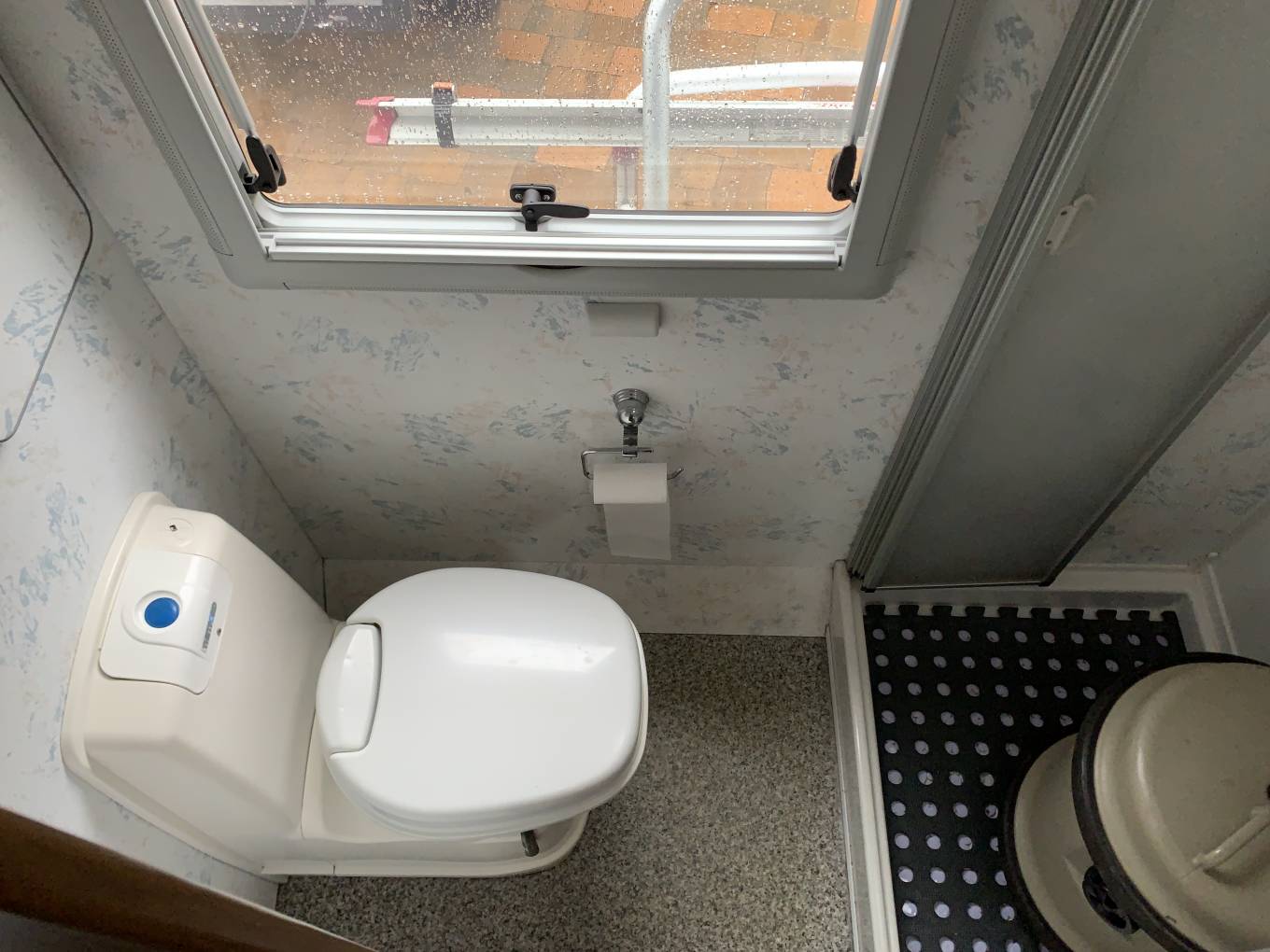 The washroom door can be clipped open giving a rear view through the window via the internal mirror.