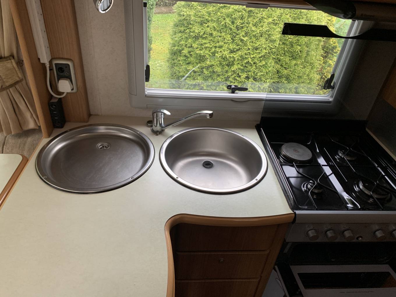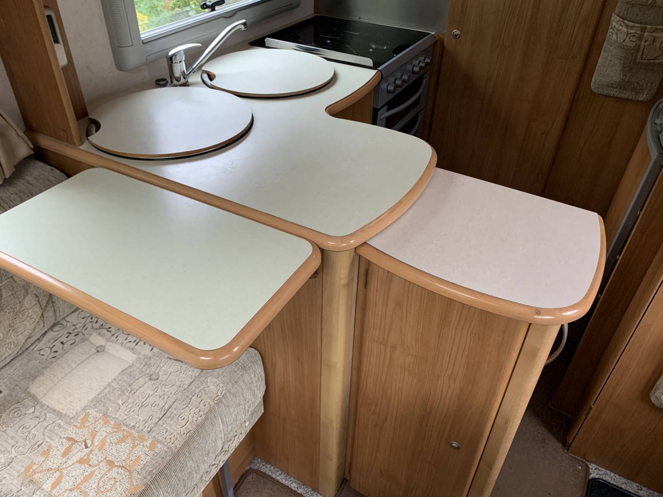 The kitchen in particular is impressive with a full size stove cooker with 3 gas burners and an electric hotplate and an extractor fan above. A circular stainless sink paired with a matching stainless drainer. Abundant storage and a clever swing out storage unit with work space above another Autocruise practical design feature.