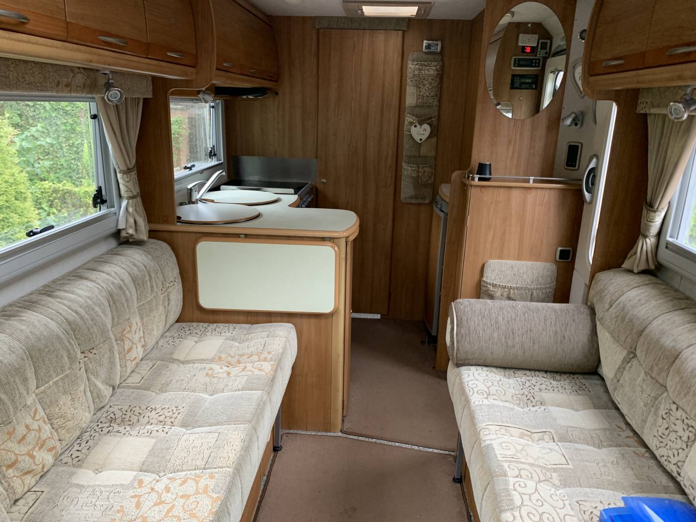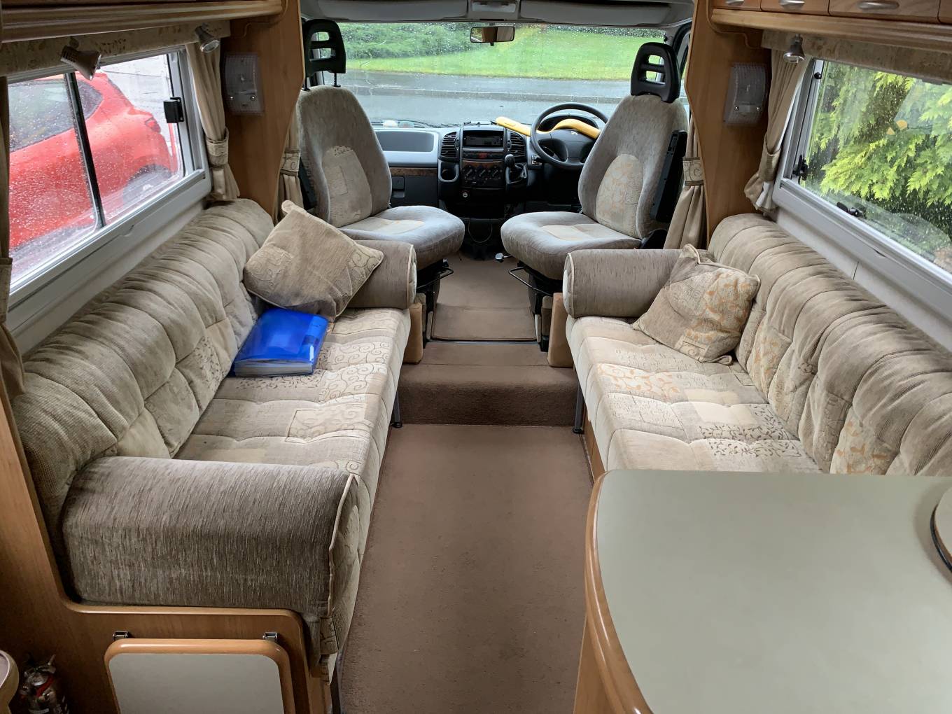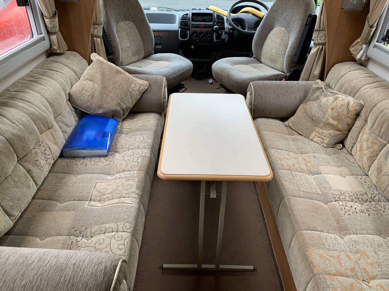 Layout is full rear washroom, mid kitchen, with upfront twin sofa lounge, enhanced by swivelling cab seats. The side sofas can be transformed into six foot plus singles or the bed supports pulled out making a very large double.
