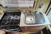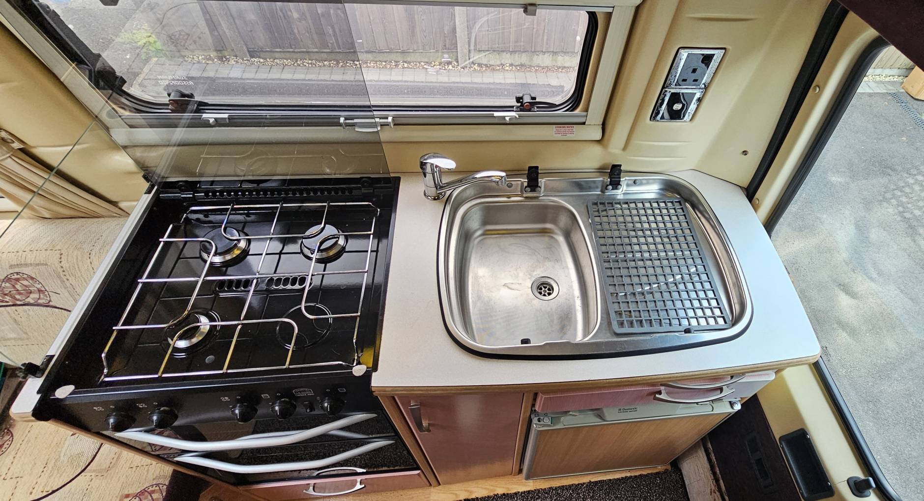 gas hob, 3 way fridge with a small freezer compartment and a sink which also