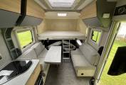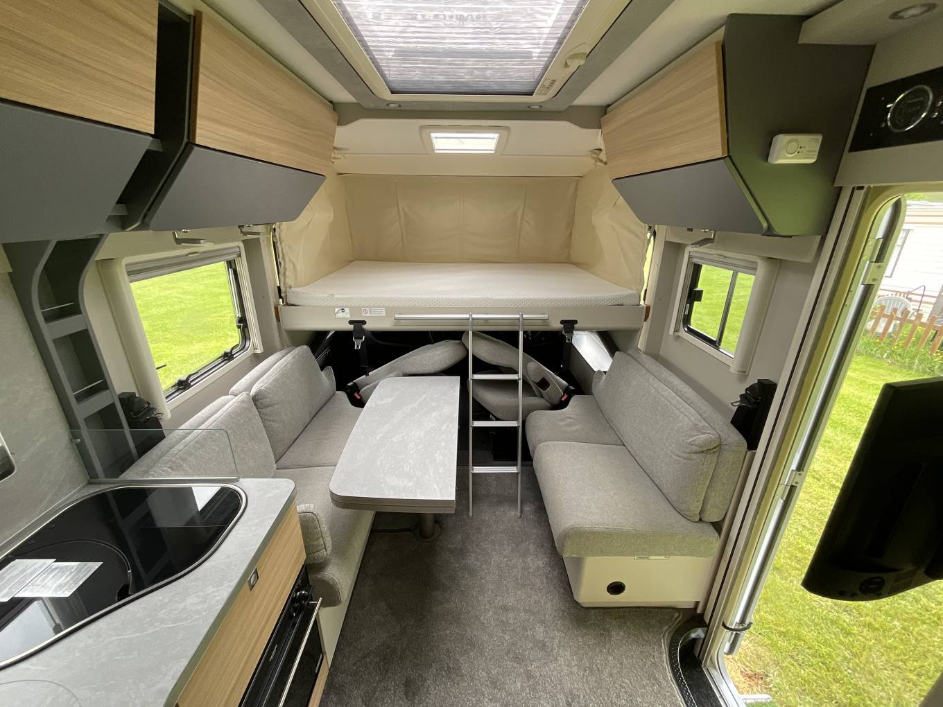 Offering panoramic views when driving and at leisure, the spacious cab can be utilised to enhance the airy forward leisure/dining/work space by rotating the swivel seats. Behind the cab are opposing double side seats with a folding central table. The side seats can be reconfigured for use as two forward facing seats with seat belts.