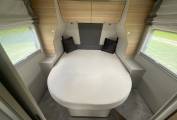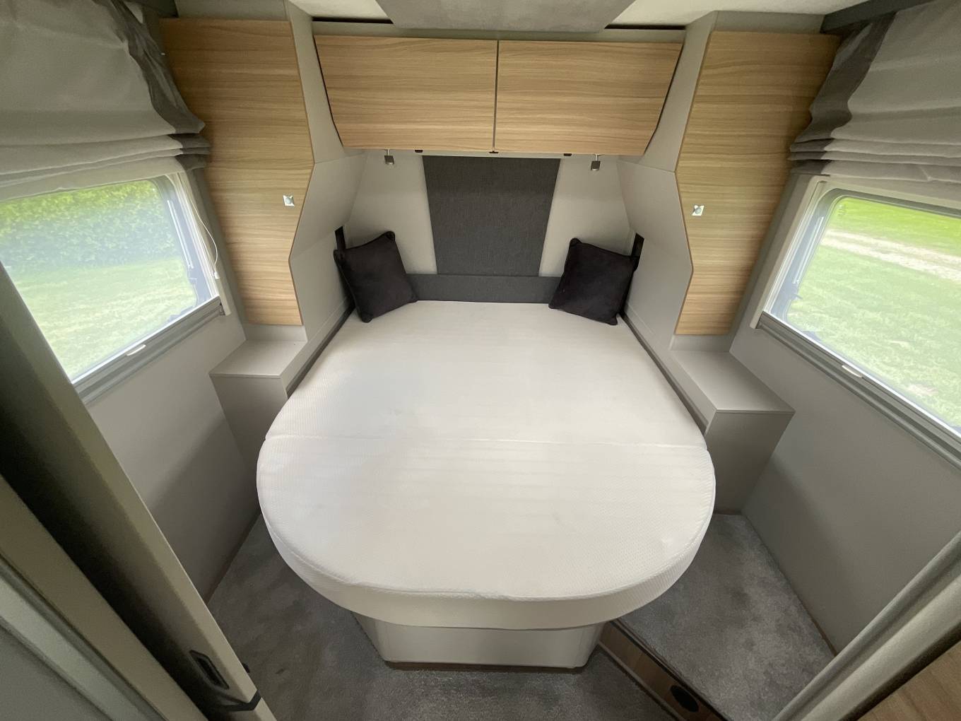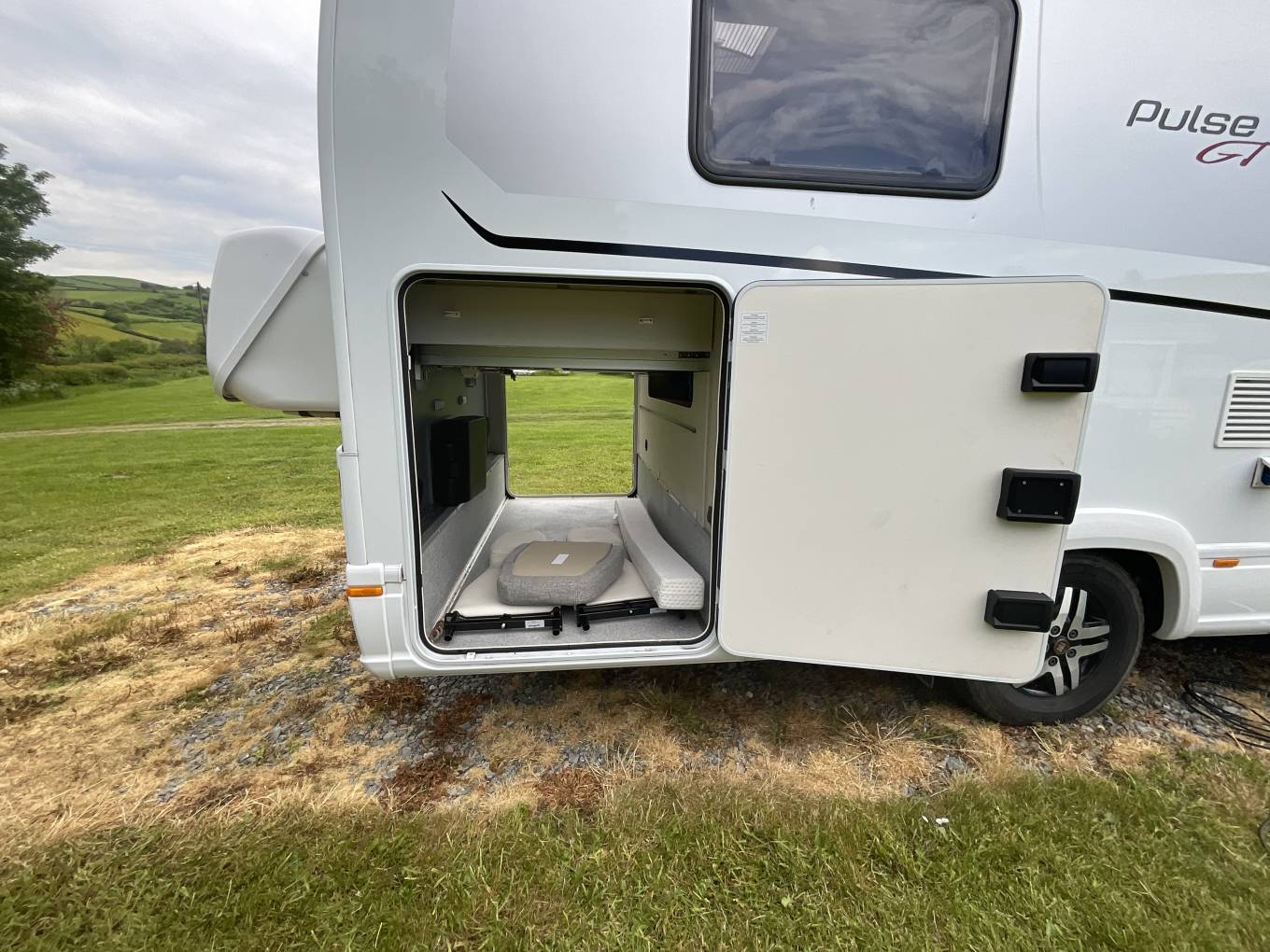 At the rear of the motorhome is a raised double island bed, located above a large rear garage, accessible internally or by rear side doors.