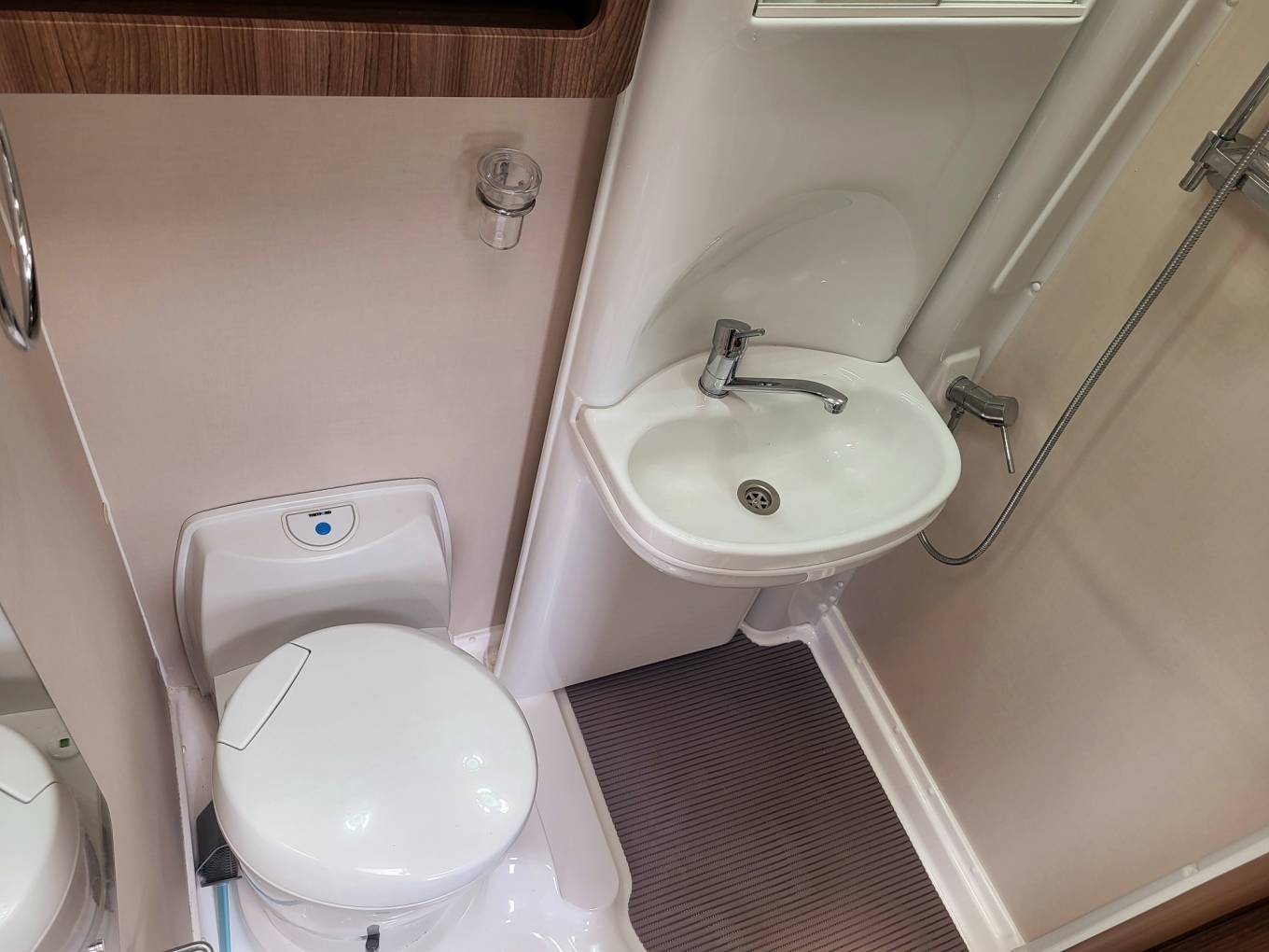 The bathroom has all of the usual amenities along with the clever hinging shower cubicle arrangement.