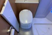 The washroom is split with a full sized shower cubicle on the offside and a flush toilet and wash basin on the nearside.