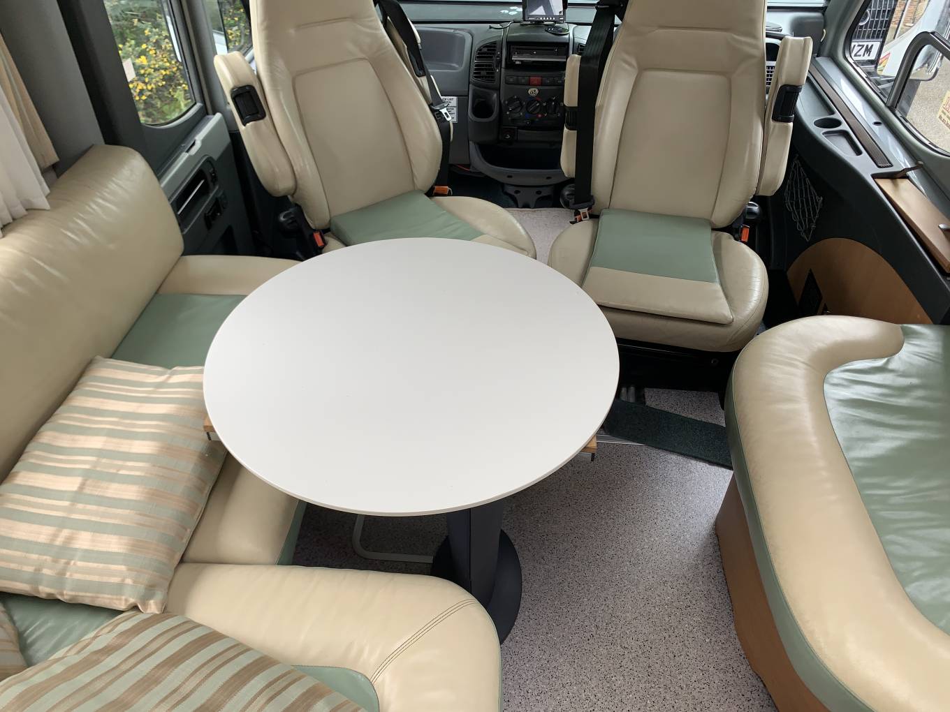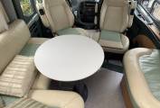 The front lounge is roomy and light, easily capable of accommodating 6 with the cab seats turned, all seating upholstered in full leather.