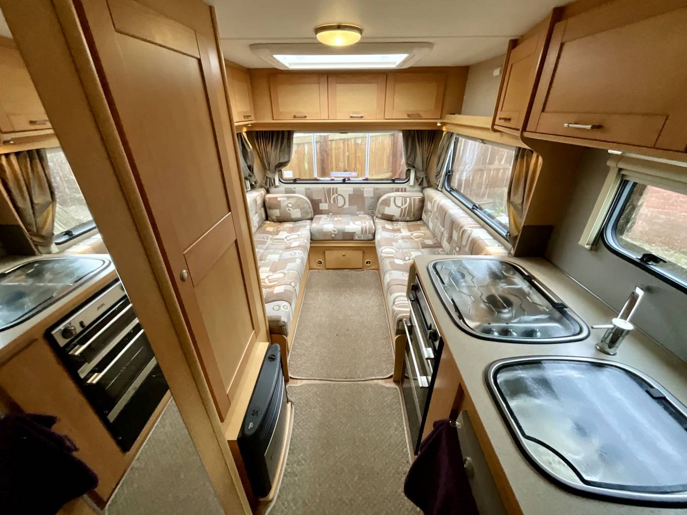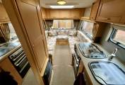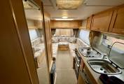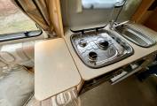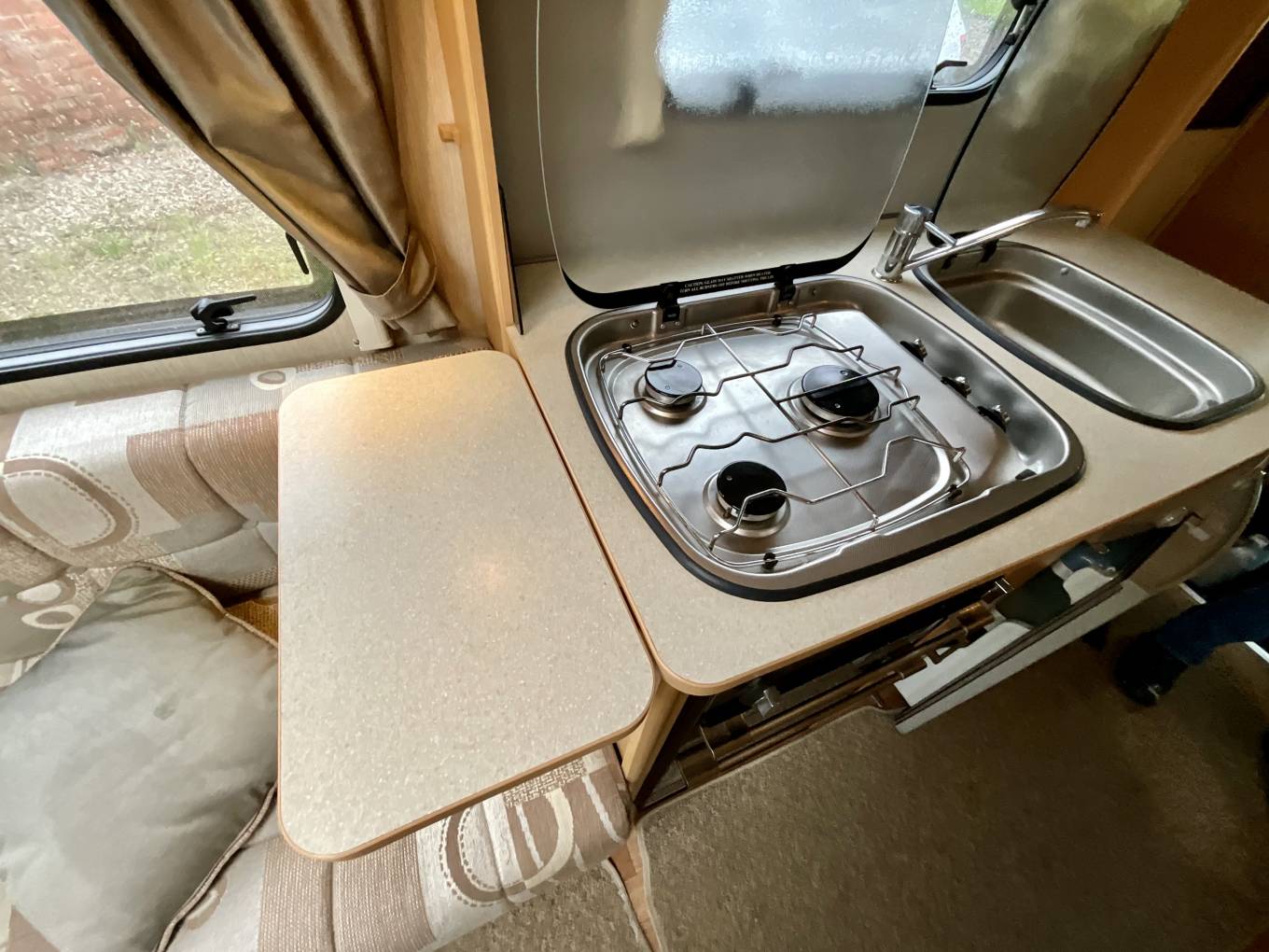 A well equipped kitchen sits in the middle of the motorhome, complete with gas hobs, fold out preparation space, sink with tap, Dometic three way fridge, Thetford oven with grill, and plenty of storage for crockery, condiments and cutlery. A Truma boiler heats up the water.