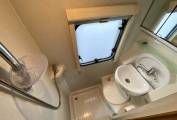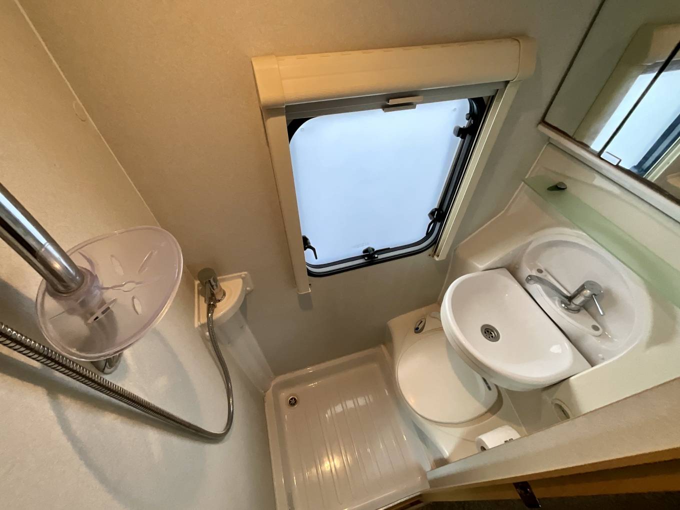 The spacious washroom comes with a shower, fold out washbasin, and Thetford toilet with cassette.
